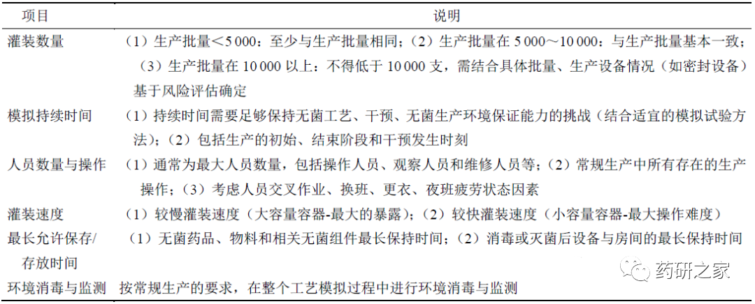 如同清洁验证等验证工作,忽略了质量管理体系单独对无菌工艺模拟试验析容易造成衔接性和体系性方面的问题[6]。在对无菌工艺模拟试验进行分析时需要理解其是在质量管理体系之下开展的,必须遵循质量管理的各项要求,应当制定一个程序文件对无菌工艺模拟试验开展的基本要求、原则、方法、标准、污染调查与处理等方面进行详细规定。无菌工艺模拟试验设计与方案制定环节需要确保无菌工艺模拟试验的范围刚好覆盖无菌操作全过程,对过程中配制、灌装、加塞、冻干、扎盖、转移、存放、停留时间、混合、取样、装配、无菌链接等影响无菌性的关键生产步骤应尽可能与常规无菌生产工艺一致(即立足于实际生产操作[7]),包括类似灌装工序中胶塞上料次数与灌装体积调节、除菌滤过后在线的滤过器完整性检测、正常的无菌生产中断等相关模拟工艺操作应与常规生产操作相似,除个别特定工艺外应避免对个别工序或操作进行单独模拟(如决定对单独工序进行模拟或分段模拟,需要有充分的评估,证明其总和能涵盖无菌操作全过程)。对于在惰性气体保护下进行无菌生产和保存的产品,需评估是否需使用空气替代相应惰性气体。此环节需要结合模拟产品的特点、模拟介质的特性选择出适宜的模拟介质,通常可选择促进微生物生长的培养基(如TSB,相当于最差条件;注意采用惰性气体时选择厌氧培养基),对于特殊剂型的产品可选择适宜的安慰剂作为模拟介质,并在使用前进行适用性确认。在模拟试验设计中,需要根据产品的不同剂型及其工艺特点(如冻干制剂、悬浊液、凝胶剂、粉末制剂、吸入剂、生物制品上游工序和无菌原料药[8])进行设计,并明确合理的干预操作、干预次数、干预时间和干预后产品的处理(注意对干预人员的培训)。在对无菌工艺和干预操作分析评估、明确有关设计的基础上,无菌工艺模拟试验方案中还需要对模拟的频率与次数(新生产线或工艺每班次至少进行连续3 次符合要求的模拟试验)、模拟过程的观察要求、培养基的制备与质量控制(包括配制、灭菌、开始前和14d 培养后的促生长能力试验等)、模拟试验方法(与空瓶切换、与无菌注射用水切换、与设备空转的切换等)、包装容器(基于矩阵设计至少包括最大和最小灌装容器,对特殊容器单独进行试验)、最差条件(表3)、灌装量(可与实际灌装体积不一致,但灌入培养基量应保证微生物生长、容器内表面覆盖的要求)与培养要求等各项具体实施的内容进行明确规定,并在方案中对无菌工艺模拟与实际工艺进行对比评估,说明二者之间的相似性。