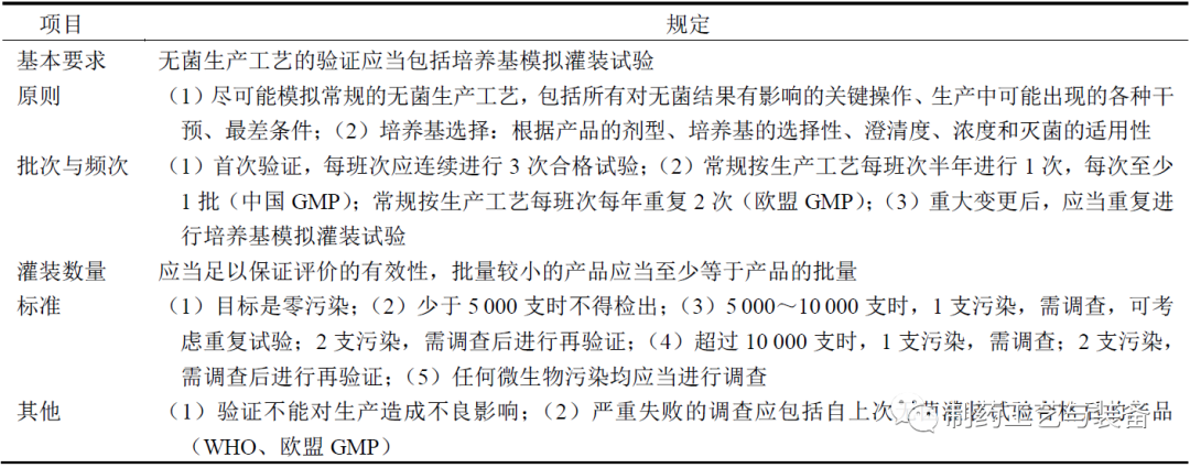 在各国药品监管机构、国际组织颁布的《药品生产质量管理规范》(简称GMP)中对非最终灭菌制剂明确要求开展无菌工艺模拟试验,如我国现行GMP 无菌药品附录的第46~48 条;世界卫生组织(WHO)无菌药品GMP(技术报告961,附录6)4.23~4.28 部分;欧盟GMP 无菌药品附录和国际药品认证合作组织(PIC/S)GMP 无菌药品附录的第66~71 条。整体上看,GMP 中对无菌工艺模拟试验主要规定的内容包括基本要求、原则、批次与频次、灌装数量、标准等方面,见表1。