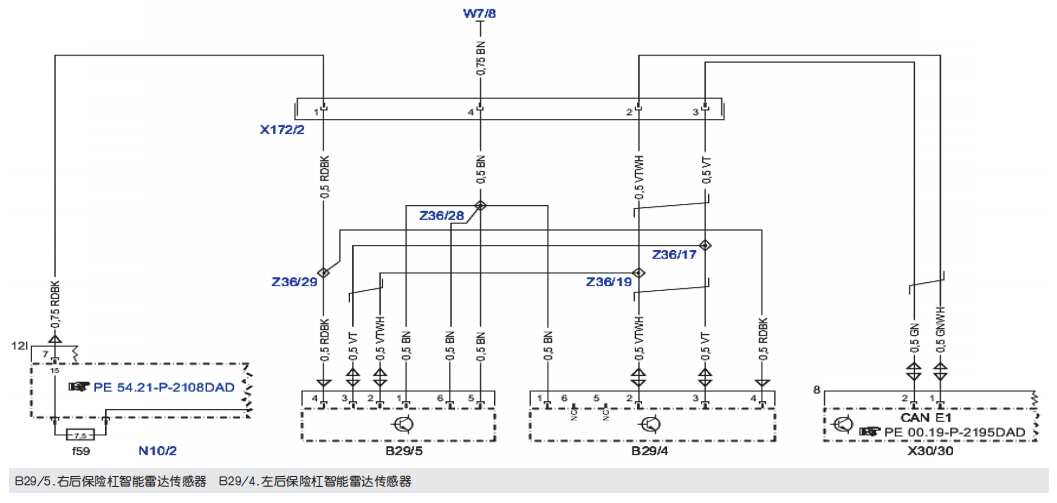 当拔下X30/30的8号CAN E网络线时故障波形恢复正常。X30/30的8号CAN E网络线通过插头X172/2连接到左后保险杠智能雷达传感器和右后保险杠智能雷达传感器,电路图如图5所示。