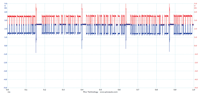从ESP控制单元处看该车的CAN E网络异常。CAN E网络属于高速网络,传输速率为500kbit/s,正常隐性电压CAN H与CANL都为2.5V,但此车的隐性电压被异常拉高为9V左右,放大局部波形观察如图3所示。