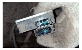 拆下后保险杠检查发现右后部智能雷达传感器处插头已经进水腐蚀,如图7所示。