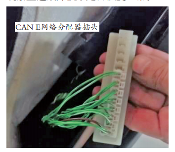 从放大的波形可以看出,该车CAN E网络的CAN H与CAN L波形杂乱无章,并不能正常的传输数据。由于CAN E网络的隐性电压过高,由此怀疑车辆的故障是由于CAN E网络线出现对正极短路的情况,或者是CAN E网络中某个控制单元内部故障出现对正极短路的情况。由于CANE网络连接的控制单元较多,该车存在CAN网络分配器插头。通过电路图找到CAN E网络分配器插头X30/30位置位于左前脚坑处。如图4所示。决定从CAN E分配器插头处依次拔下所连接的控制单元,并观察上述故障波形是否恢复正常。