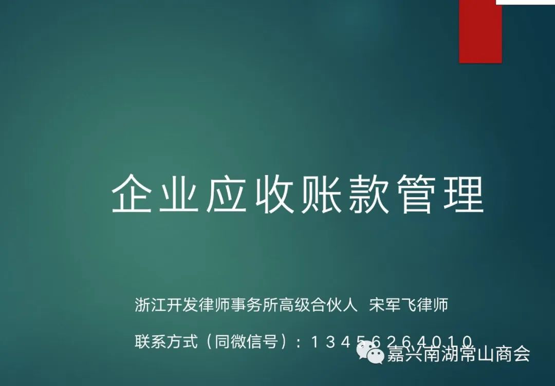 由商会法律顾问宋军飞律师为与会人员讲解企业应收账款管理的问题,应收账款是在企业日常经营过程中,因交易行为发生而形成的一项债权。许多企业都会面临应收账款催收的问题,为此,商会特邀请宋军飞律师为会员讲解《应收帐款管理》的精髓和要点。