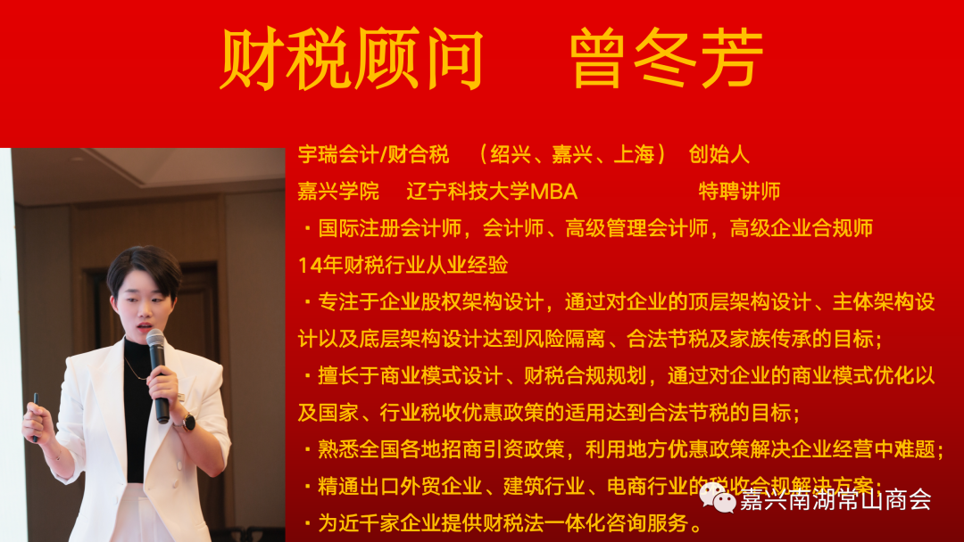 由商会财税顾问曾冬芳女士为会员企业讲解企业税务知识,此次讲座将帮助会员企业及时了解当前的财税政策环境,规避财税风险,并提高会员企业对税务知识的了解。