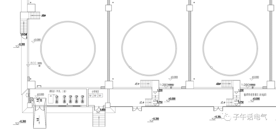 由于酒罐较高,上图中的酒罐就有15米多,而上部一般没有照明需求,可以选择壁装式防爆灯具,规模较小的酒库可以采用集中控制,上图中,建议一个分隔设置1~2个防爆照明开关即可,管线采用低压流体输送用热镀锌钢管明装,这点非常重要,不要采用暗装,这是很多设计师容易犯的毛病。