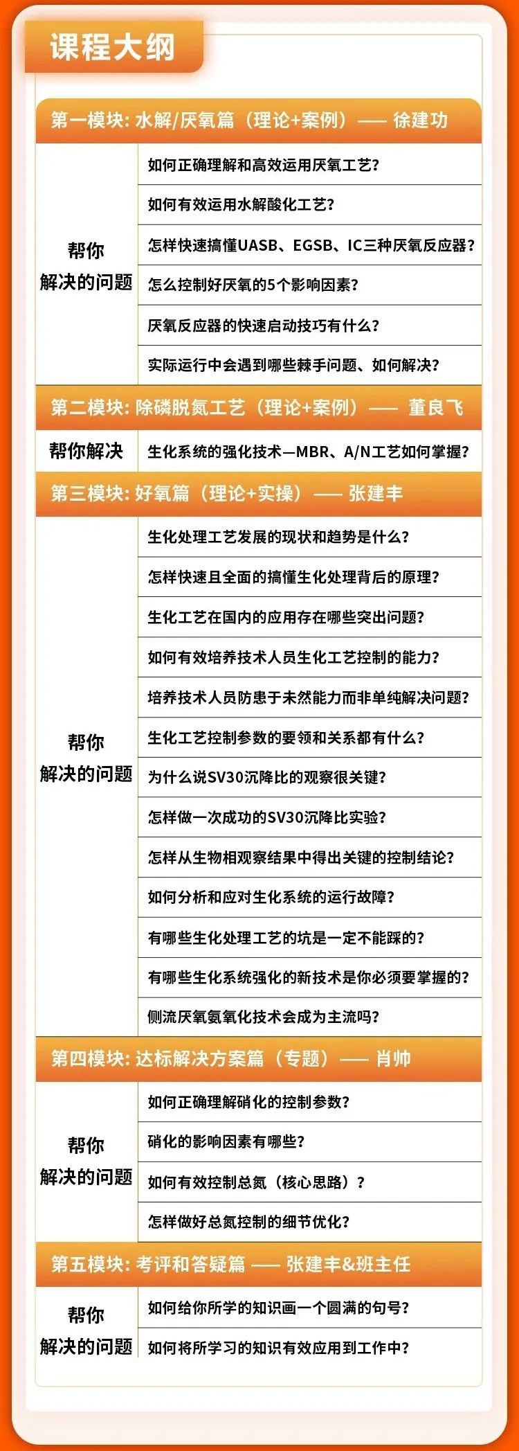 帮大家熟练掌握有效的活性污泥诊断和养护方法论、搞懂常用厌氧反应器的影响因素及运营要领、以及掌握氨氮、TN的有效控制思路和优化方式。