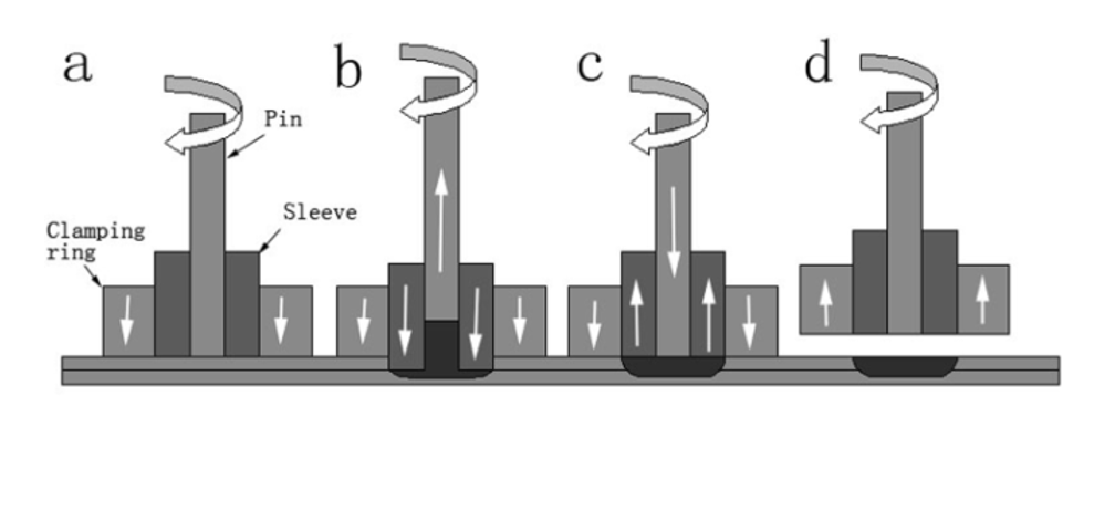 摩擦预热阶段 →搅拌套下压及搅拌针回抽→搅拌针下压及搅拌套回抽 →平磨形成平整焊点