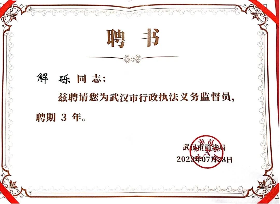 武汉互联网产业商会会长、红桃开集团股份有限公司执行总裁解砾被聘任为“武汉市行政执法义务监督员”