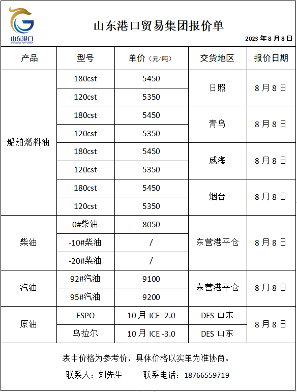 山东港口贸易集团油品报价(8月8日)