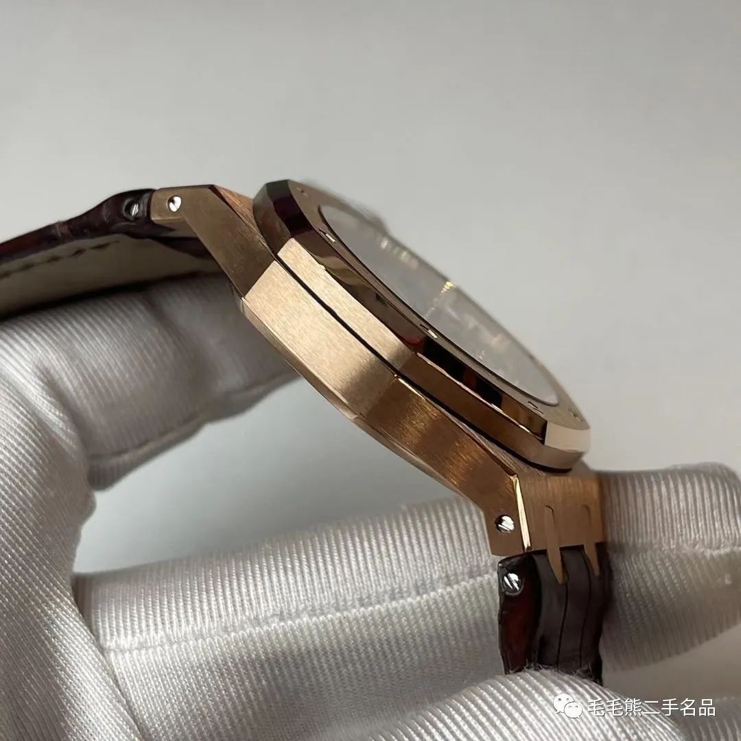 爱彼皇家橡树系列26120OR,18K玫瑰金材质,39mm表径,银白色格纹表盘,日期、动储显示,两地时功能,自动机械男表,折叠扣,公价262000,二手单表好价?