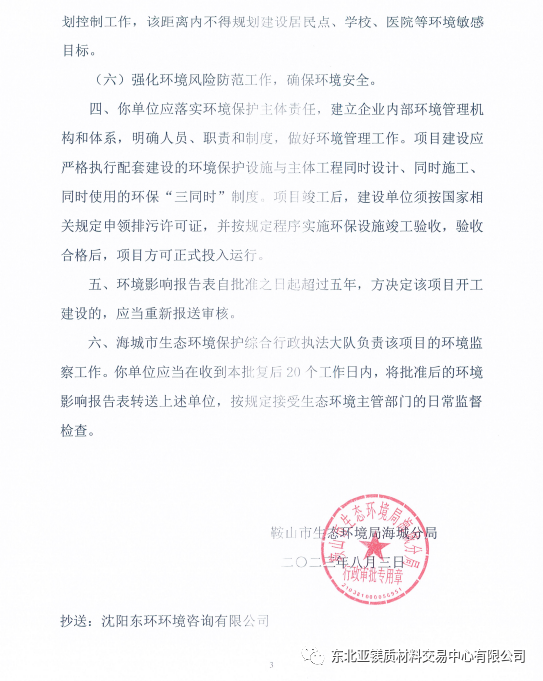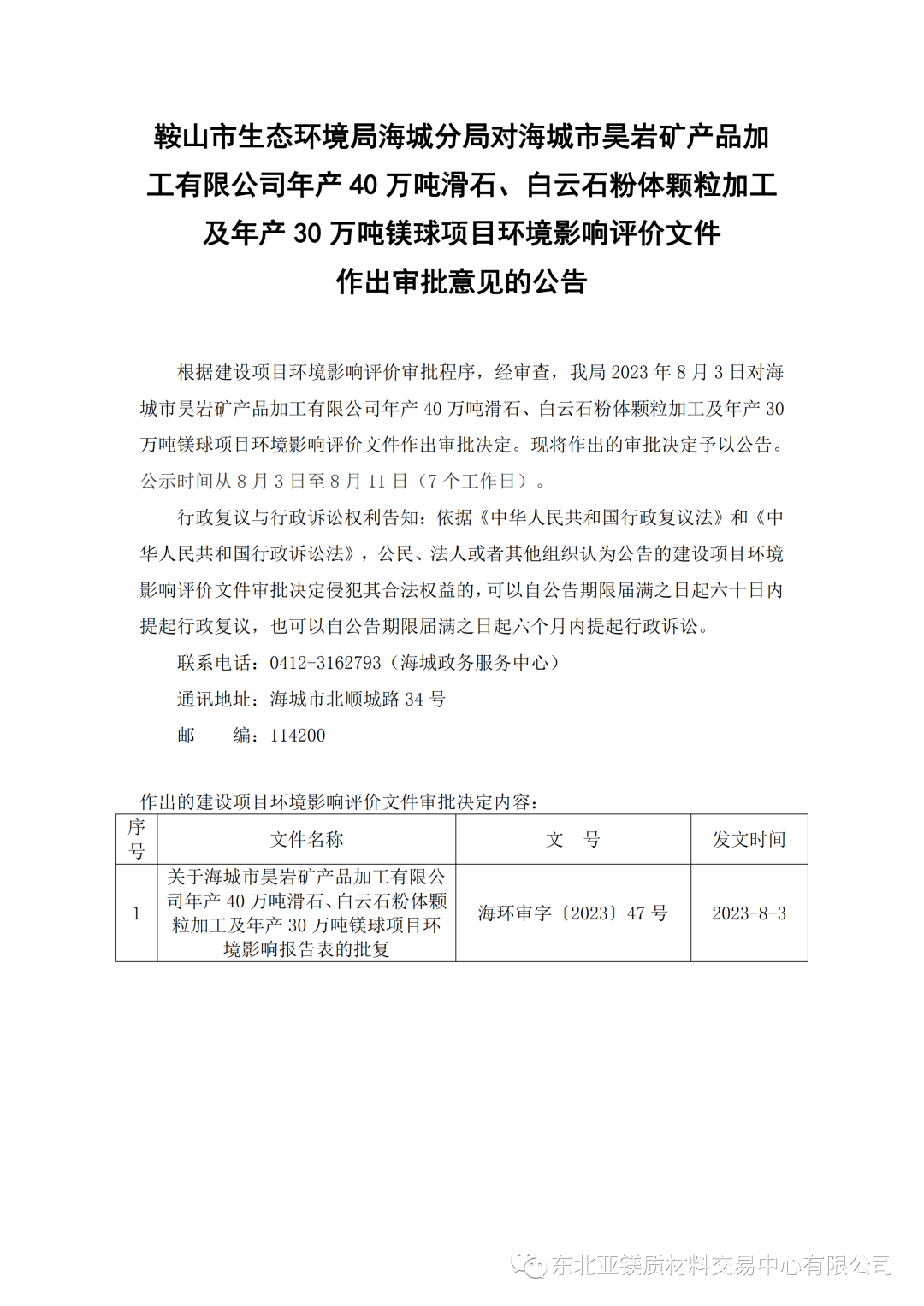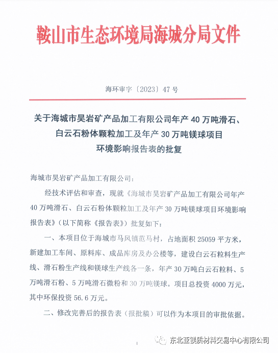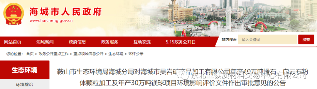 海城生态环境局对海城市昊岩矿产品加工有限公司年产30万吨镁球等项目环境影响评价文件作出审批意见的公告