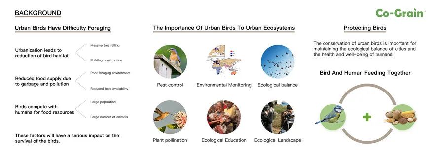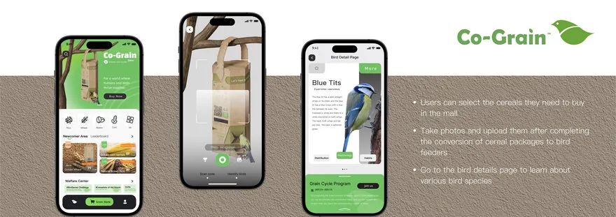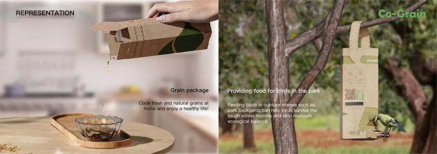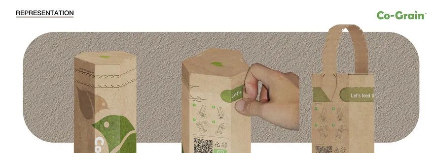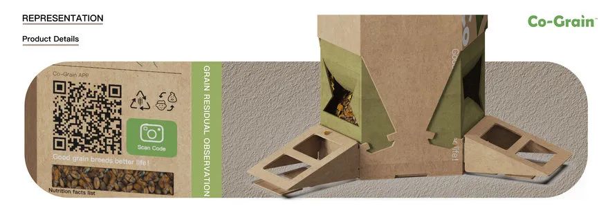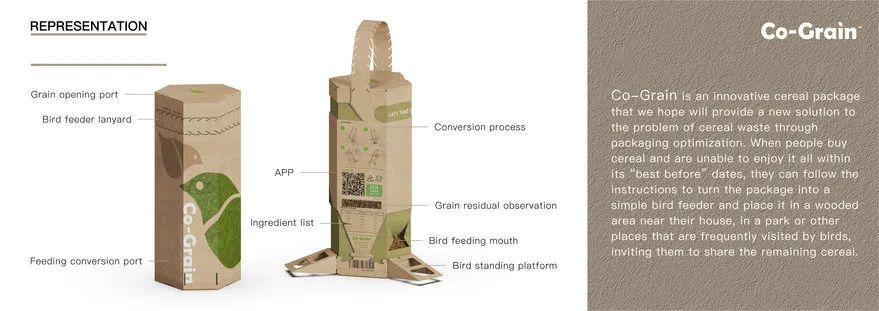 Co-Grain是一种解决这两个问题的设计方案,它将谷物包装重新用于喂鸟者,为城市鸟类提供食物,同时减少谷物浪费。该设计的灵感来自可持续发展和环境保护的概念,促进负责任的粮食采购和减少浪费。