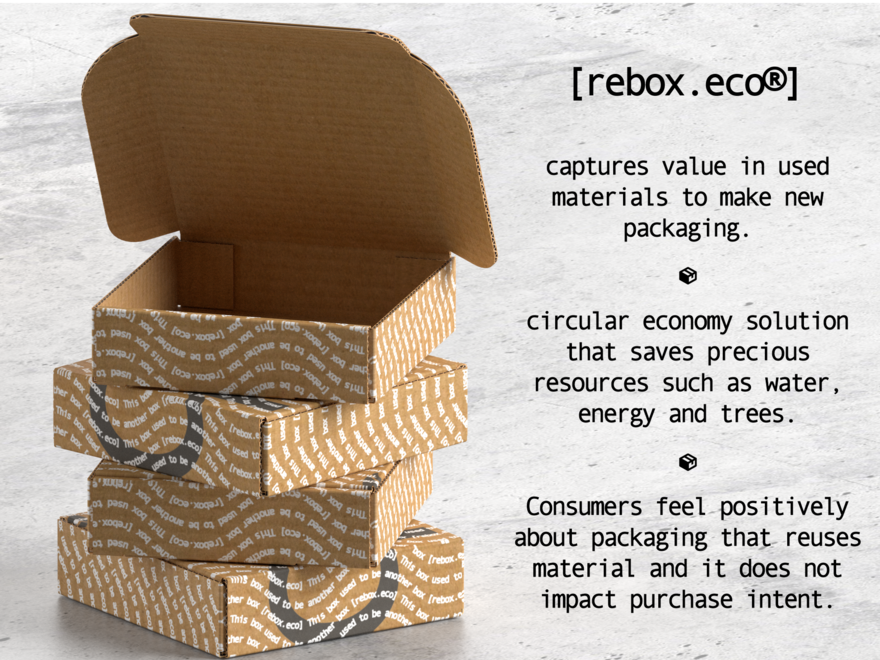 [rebox.eco]用旧盒子制作新盒子,通过捕捉旧材料的价值、最大限度地减少资源开采和减少浪费,帮助品牌更可持续地发送电子商务快递。企业正在努力寻找他们需要的包装,并诉诸不太理想的解决方案,因为市场看到需求不断增加,纸张供应有限。与此同时,像英国这样的国家不能回收所有的废纸,超过一半的废纸被出口,这往往导致处理不当。[rebox.eco]是一项运营创新,它将这些因素结合在一起,捕捉并增加被视为废物的价值。