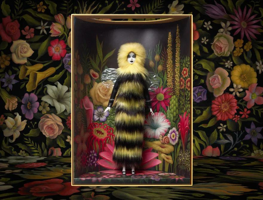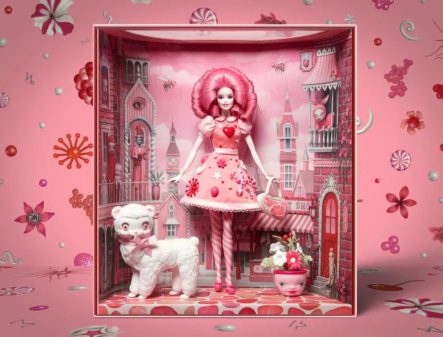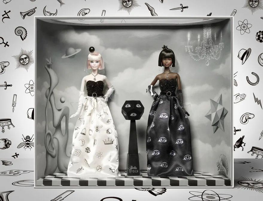 芭比颂扬艺术家马克·莱登的独特风格,他是被称为流行超现实主义的当代艺术运动的有影响力的领袖。使用赖登的艺术和精致的娃娃设计的故事,包装采用大胆的颜色,压花标志和金属箔。一个高架平台提高了每个娃娃在他们自己的梦幻,彩绘世界,因为激光精确吸塑包装强调他们的形状。