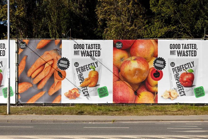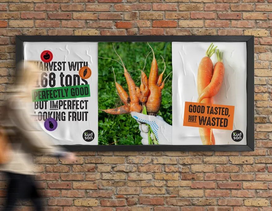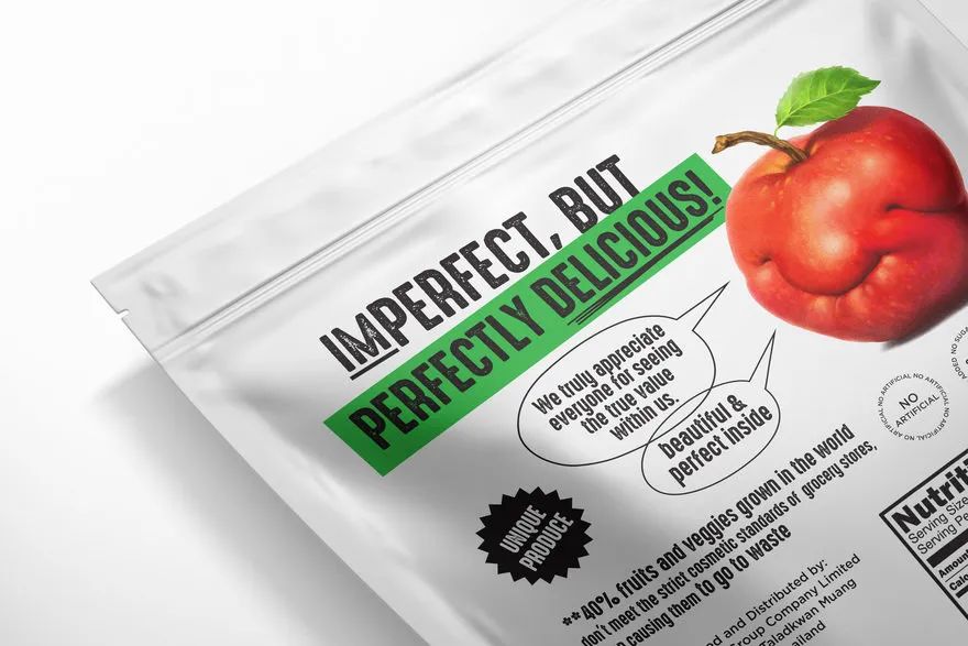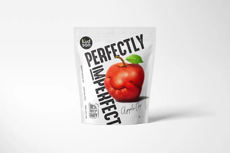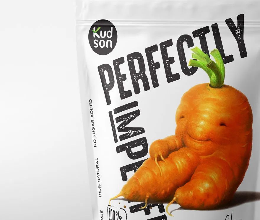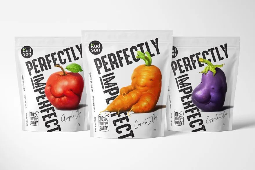 因此,生产油炸水果和蔬菜的KUDSON品牌打算帮助消费者认识到其内在价值,而不是其外在的不良外观。然后,该设计通过对可接受的难看的水果和蔬菜(例如奇形怪状的苹果、畸形的茄子和三条腿的胡萝卜)的说明来宣传“完美不完美”的概念,具有消费者可感知的快乐微笑水果的真诚外观。