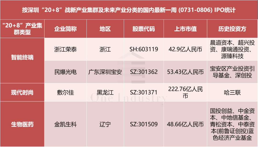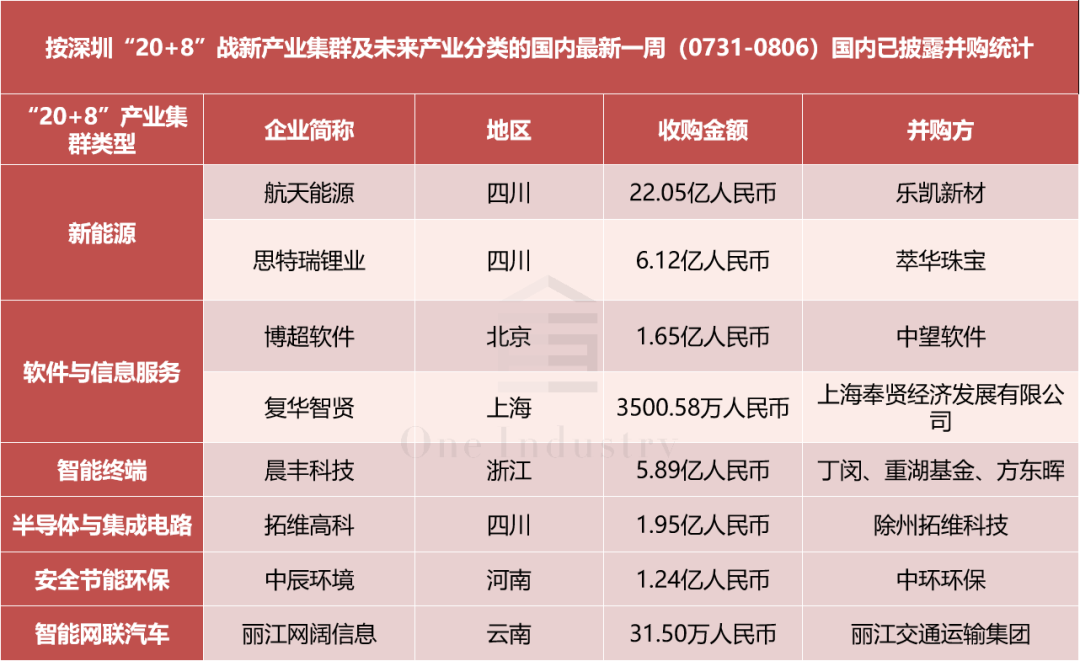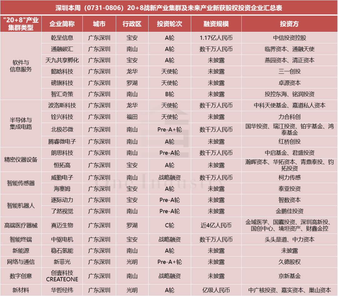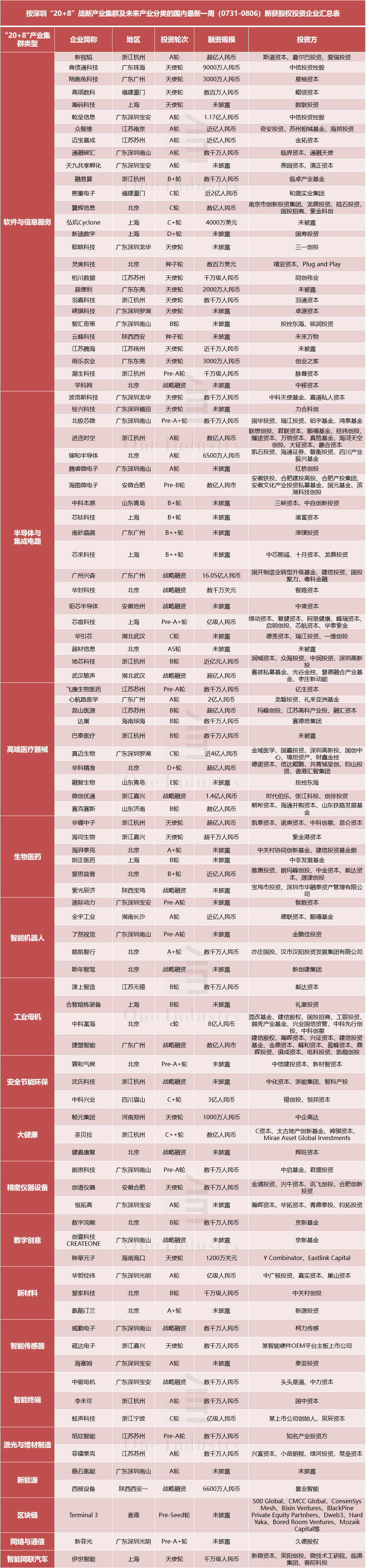 备注:本表格中仅统计符合深圳“20+8”产业集群类型的企业;统计口径上,本周(0731-0806)对应财联社创投通数据周报(0729-0804)、私募通数据周报((0729-0804)和睿兽Pro投融资周报((0729-0804)。