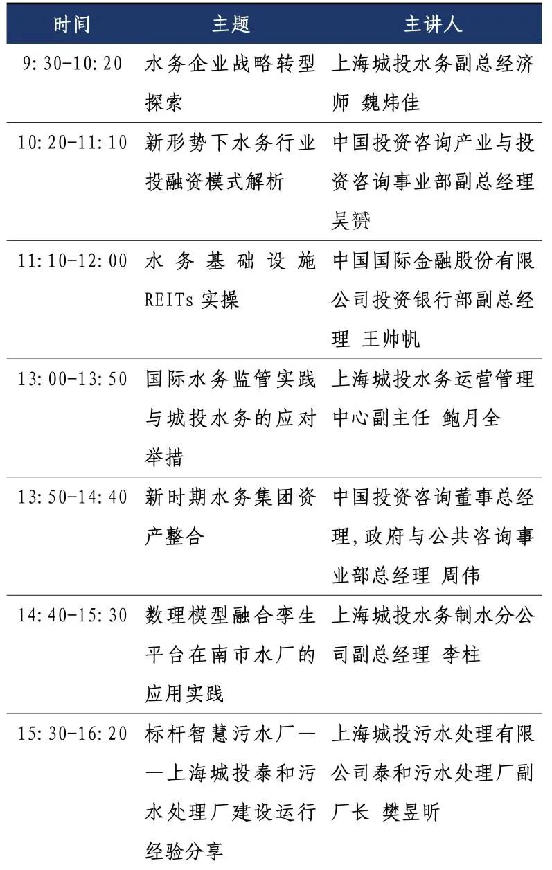 为助力水务行业高质量发展,解决水务行业从业者面临的痛点、难点问题,本次研讨会准备了7场专题分享会,从战略转型到投融资模式,从新技术应用到新业态研讨,从宏观分析到案例分享,我们力求做到场场有干货,场场是精品,力争做到助力实践、前瞻未来。