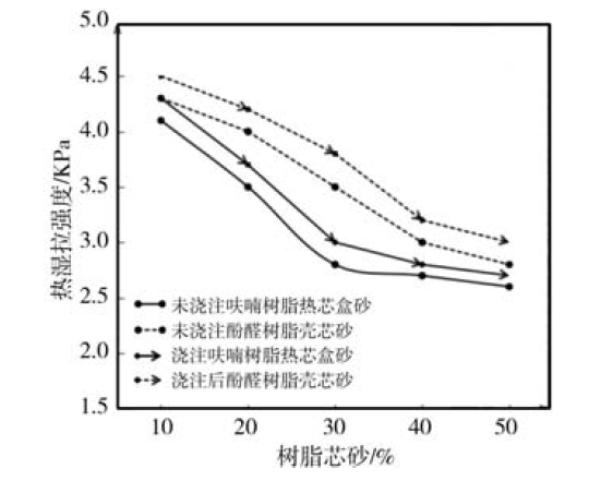 图6 芯砂对热湿拉强度的影响