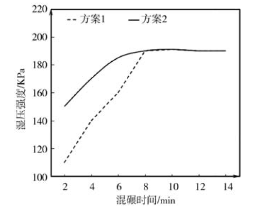 从混砂开始,两种方案的湿压强度均随混砂时间的增加而呈强劲上升趋势。不同的是方案2的湿压强度在混砂初期比方案1更高,混砂时间达到7min左右的时,方案2的湿压强度已达峰值,后续再增加混砂时间其湿压强度保持峰值不变;方案1的湿压强度仍呈上升趋势,直到混砂时间达到8min后,方案1与方案2的湿压强度趋于一致,后续再增加混砂时间,方案1方案2的湿压强度也将保持不变,见图2所示。