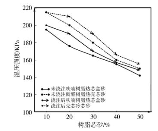 3.2.2 芯砂对热湿拉强度和湿压强度的影响