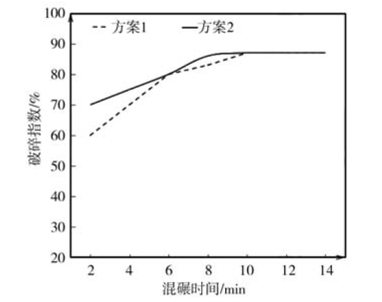 方案1和方案2的破碎指数从混砂开始后的6min前均呈上升趋势,虽然方案1的起点更低,但上升速度却更快,当达到6min时两种方案的破碎指数达到了一致;从6min以后方案1的上升速度开始变得平缓,直到10min后达到峰值,之后破碎指数不再上升;从6min以后,方案2的上升速度基本保持不变,直到9 min达到峰值,同方案1的破碎指数相当,见图4所示。