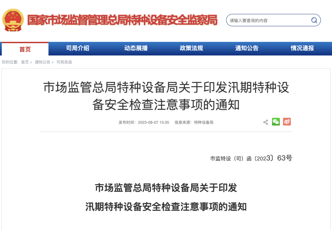市场监管总局特种设备局关于印发汛期特种设备安全检查注意事项的通知