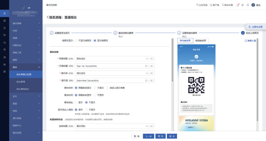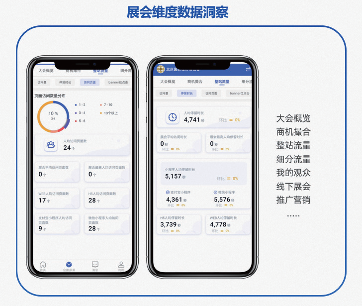 六是便捷逛展功能,通过展会推广页面定制、Web/ 小程序多端呈现等提升线上逛展体验观众逛展功能。