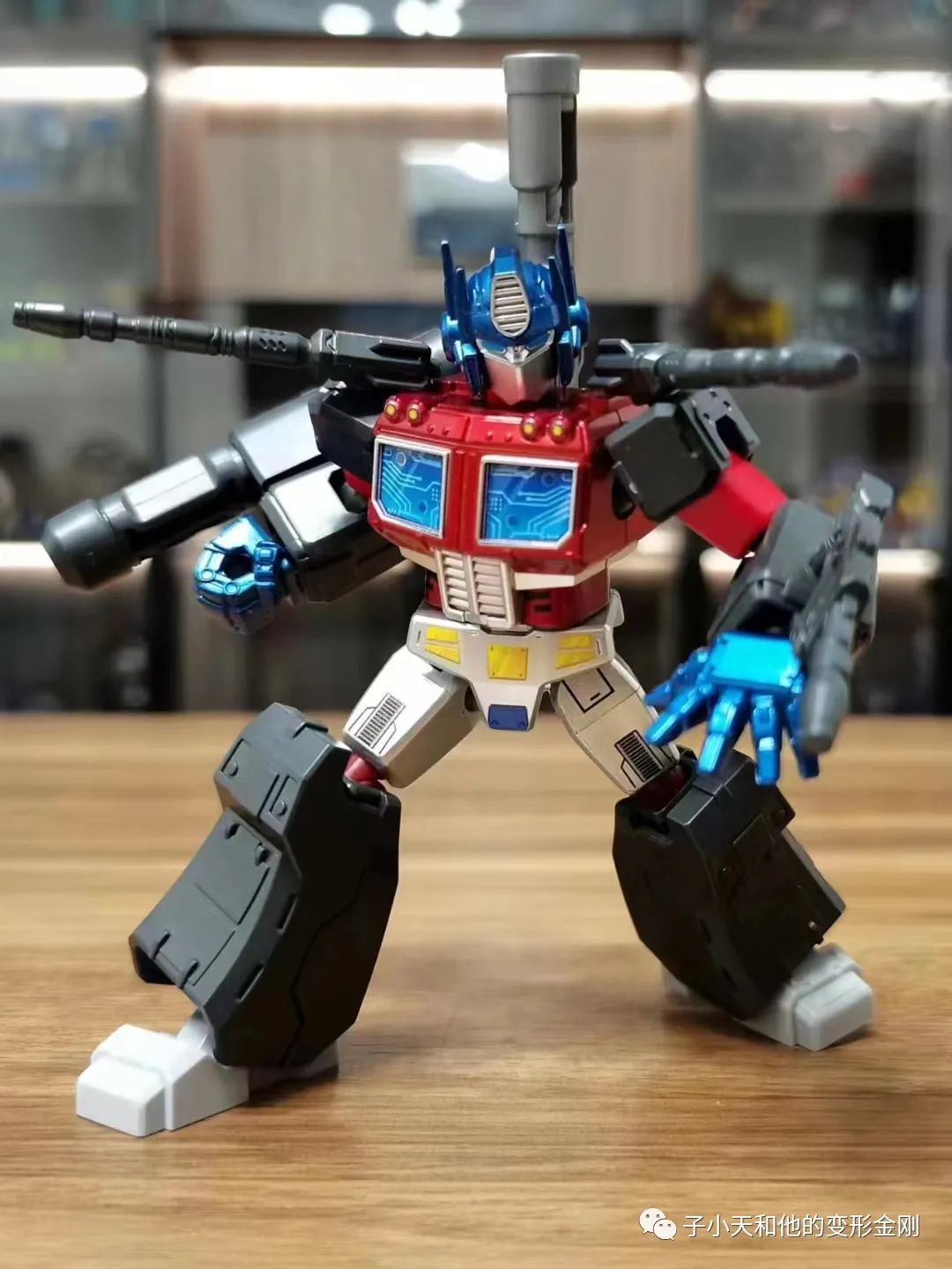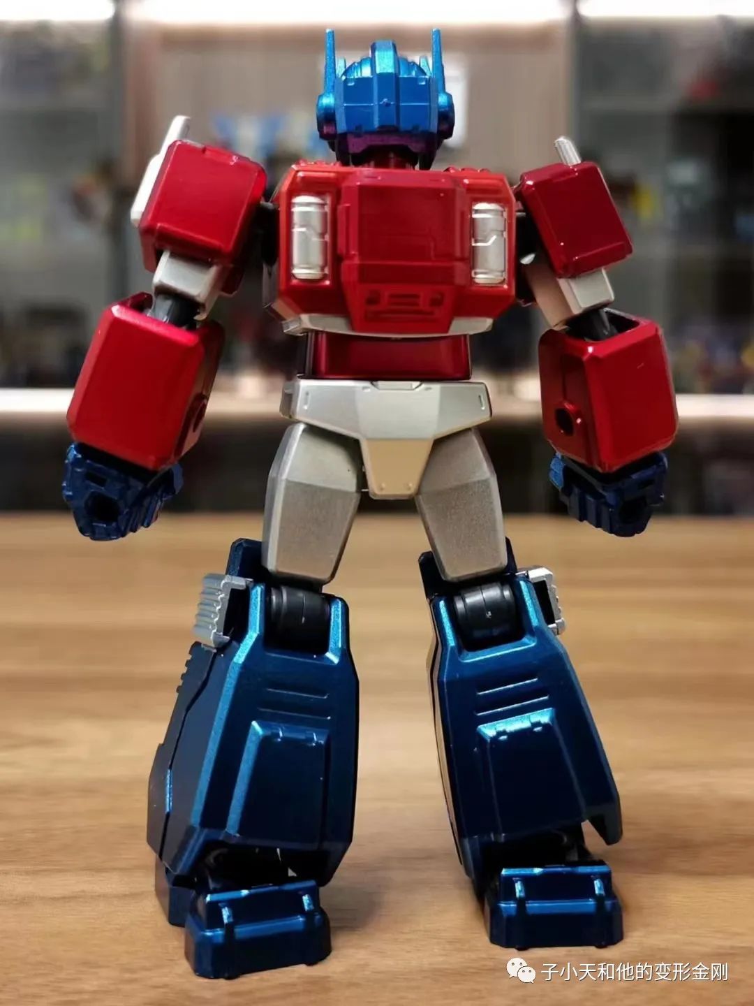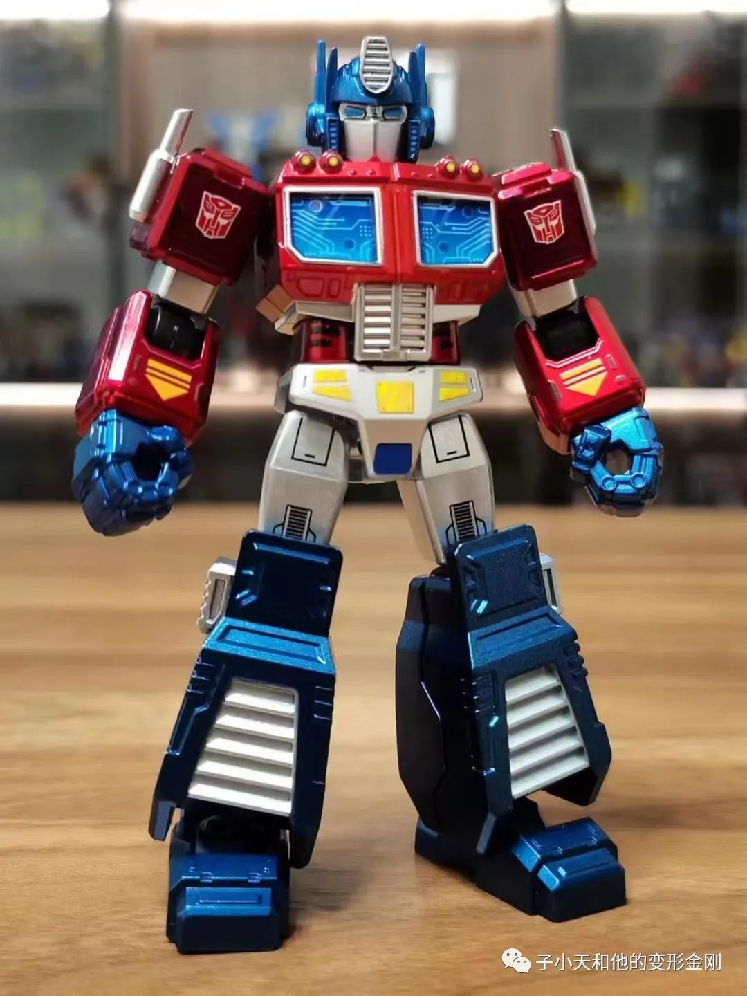 先看擎天柱吧,运气比较好,开到了隐藏款。隐藏款擎天柱全身都是上了金属漆,非常漂亮,涂装也比普通款的更精致,比如大腿的转印涂装,都是原色版本没有的。布鲁可的这款擎天柱造型很不错,稍微Q一点点的身材比例很讨喜。