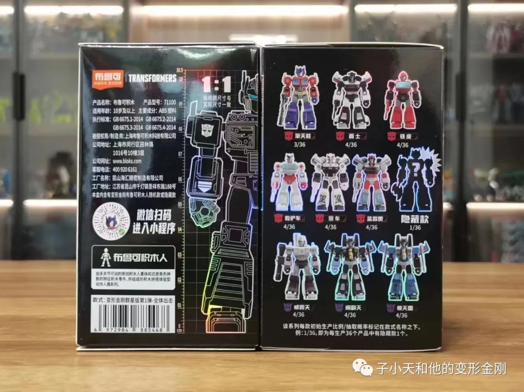 一箱总共九个盲盒,每个盲盒的外观都一样,一侧是擎天柱,一侧是威震天,其余两侧则介绍了玩具的东西以及可能抽到的角色。从抽取的概率可以看出,每四箱中会出一盒隐藏款,概率还是很高的。