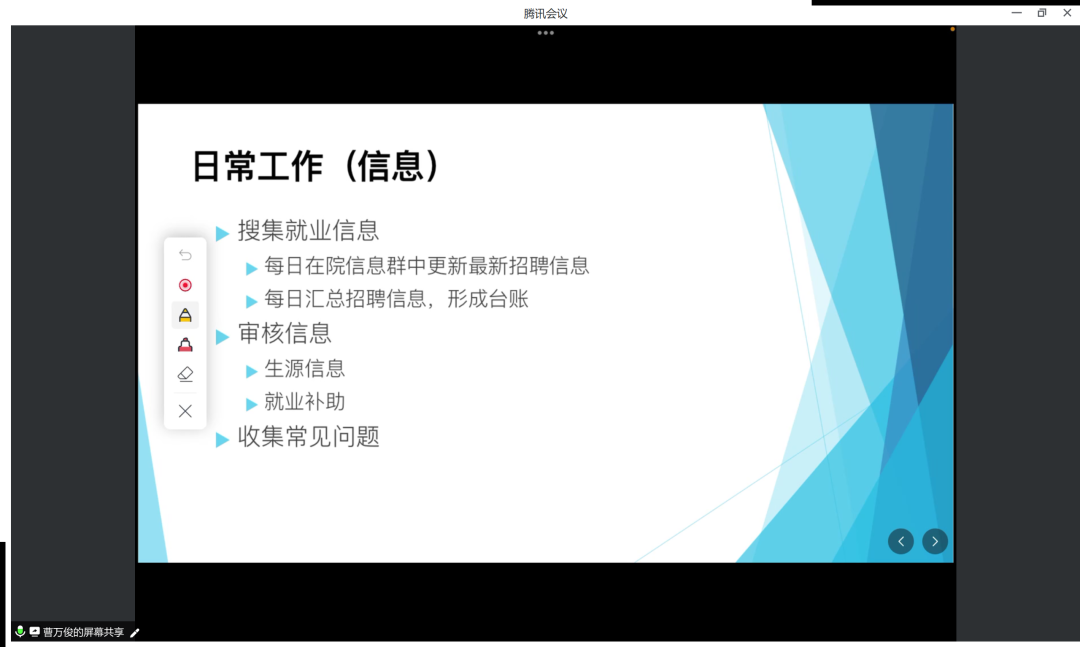 其次,曹万俊学姐介绍了就业股主要的工作内容以及常见问题等,指出除了日常工作外,就业股的工作还包括组织动员、培训会议,跟进年级就业情况等内容。期间,曹学姐分享了19级就业股的经验与不足并针对性地提出了改进建议。在周老师和曹学姐详细的介绍下,就业股成员对就业股的工作有了更深入的了解,并展开了热切讨论,气氛活跃而融洽。