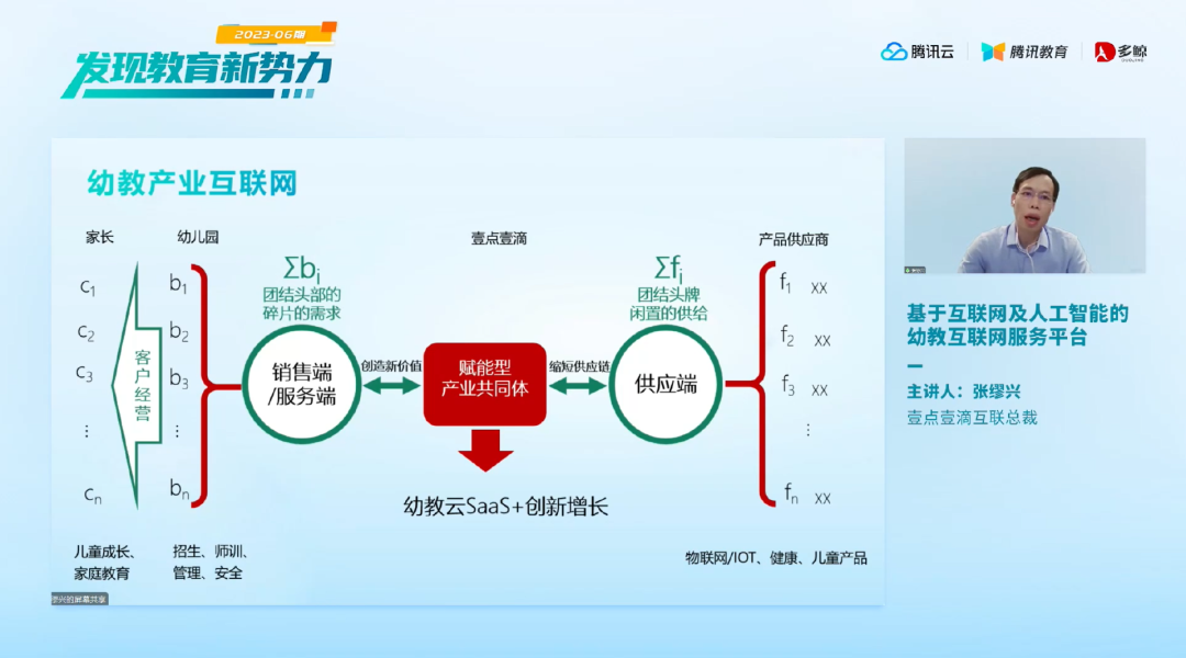 谈及幼教行业的数字化发展前景,在出生人口下降、幼儿园失去生源的背景下,壹点壹滴总裁张缪兴表示想要继续深耕幼儿园服务赛道,需要通过数字化和互联网技术来提升效率、应对挑战、实现差异化竞争;相反,如果试图转换赛道,壹点壹滴的发展模式提供了有效借鉴。「最早我们作为一家幼教产业互联网,所有的幼儿园单体体量很小,没法自己研发系统和搭建平台,我们就连接上游的供应商与这些分散的幼儿园,这就是我们说的幼教产业互联网,这也是壹点壹滴过去几年一直在做的事。」