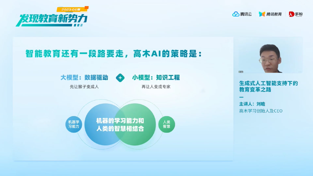 针对解决以上提到的问题,刘瞻介绍了其技术策略,即大模型与小模型相结合的方法。小模型是凝结了人类智慧的大数据知识工程;而大模型则完全是数据驱动的。「简单而言,大模型把猴子变成人;小模型让人变成专家。」刘瞻分享道。这两种模型共同形成了「教育大脑」。教育大脑可以应用的场景包括智能学伴、智能导师、智能助教和智能督学等,目标是发展适合每个学生的教育。
