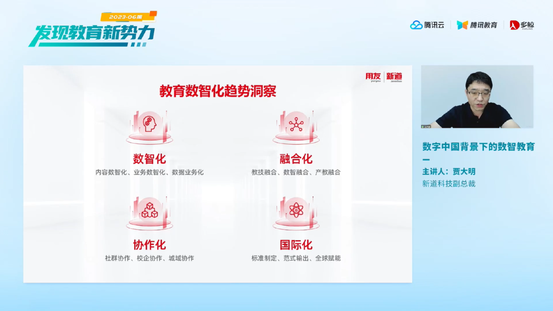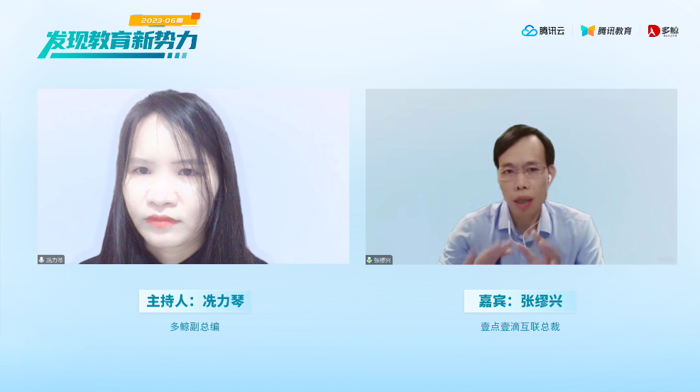 8 月 3 日下午,多鲸、腾讯云和腾讯教育共同发起 2023 年「发现教育新势力」第六期。本期在线论坛,邀请了新道科技副总裁贾大明、高木学习创始人及 CEO 刘瞻、ACG 国际艺术教育 CTO 苏波、彩色斑马学院创始人王伟和壹点壹滴互联总裁张缪兴共五位嘉宾,分别来自职业教育、教育信息化、艺术教育、素质教育、早幼教等多个领域,齐聚云端共同探讨教育行业的发展新方向。