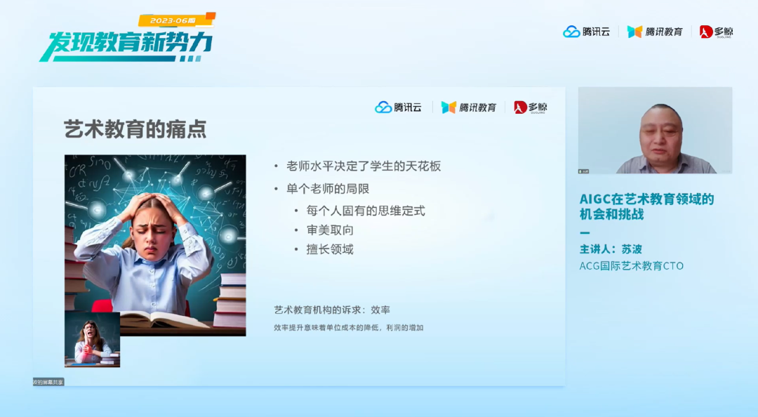 苏波指出,艺术教育目前存在两大痛点。首先,老师的水平决定了学生水平的天花板。类似于学习围棋,如果学生选择一个业余五级水平的老师教学,即使学生再聪明,也可能在水平达到四级或三级时遇到瓶颈。换句话说,老师水平的局限性也限制了学生的进步。其次,每位老师都有固定的思维方式和审美取向,尤其是在从事教学时间较长的情况下,改变其习惯是很困难的。这种固化的思维和取向可能会弱化教学效果,而现在急需通过技术手段来突破这些限制。另外,除了艺术教培领域之外,如何使用 AIGC 技术实现降本增效,提高教学质量,培养多元化人才,将成为所有商业机构都需要关注的问题。