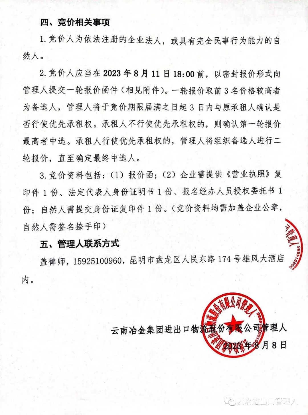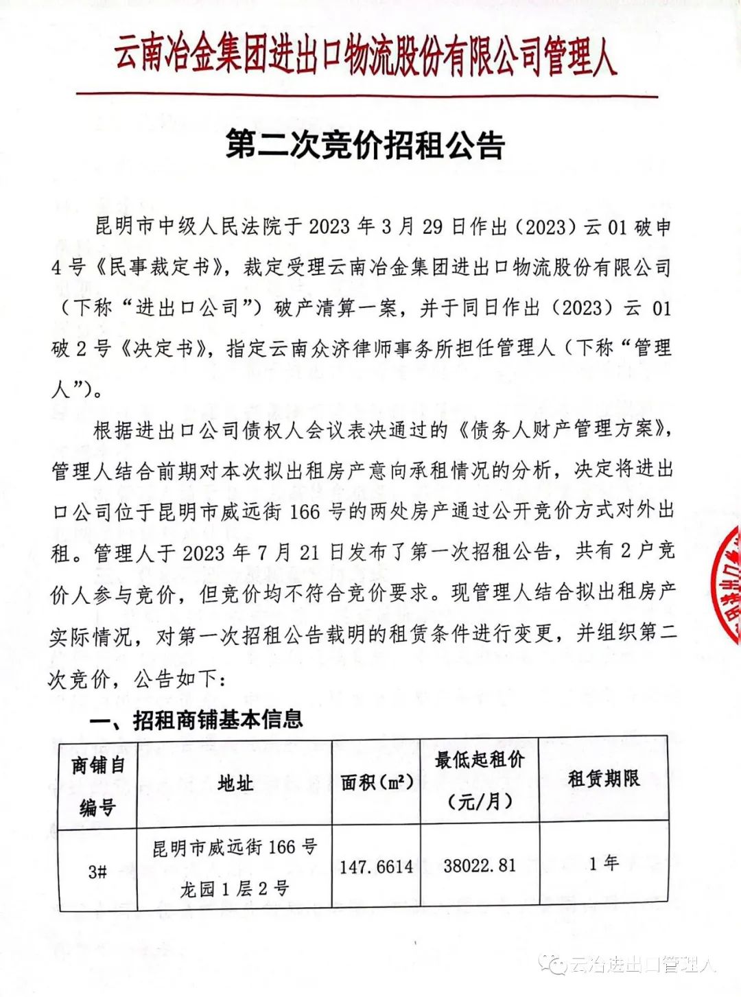【公告】云南冶金集团进出口物流股份有限公司第二次竞价招租公告