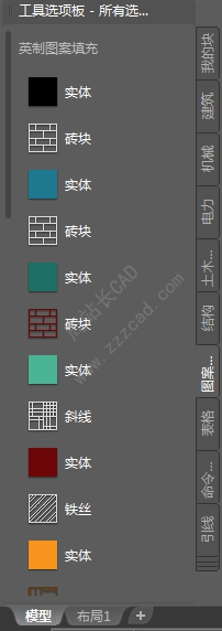 同时按下ctrl+3,便可以调出工具选项板,它会自动出现在CAD软件的左侧。