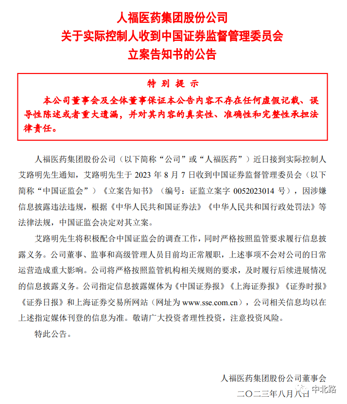 微信公众号中北路获悉,武汉企业:人福医药关于实际控制人收到中国证券监督管理委员会立案告知书的公告。