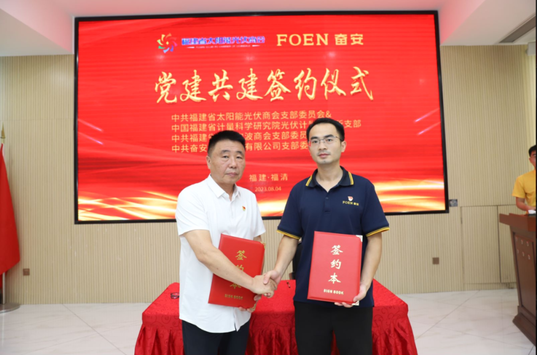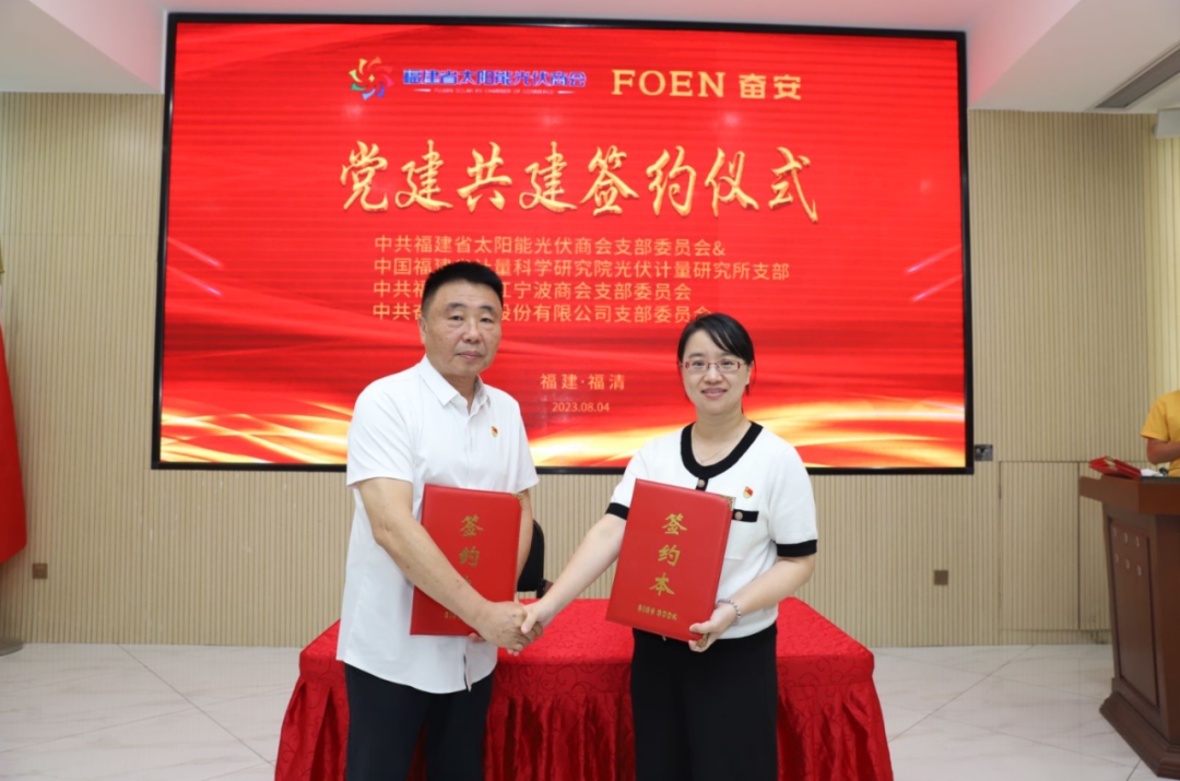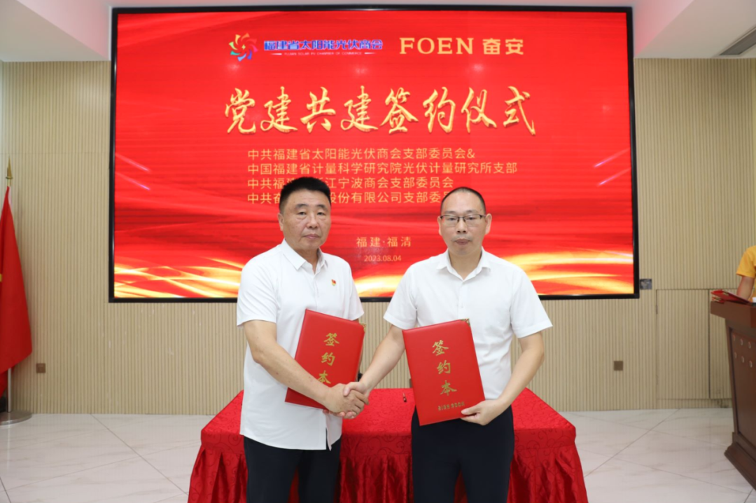 会议现场,中共福建省太阳能光伏商会支部委员会还分别与中共福建省计量研究院光伏技术研究所支部、中共福建省浙江宁波商会支部委员会、中共奋安铝业股份有限公司支部进行了党建共建合作签约。