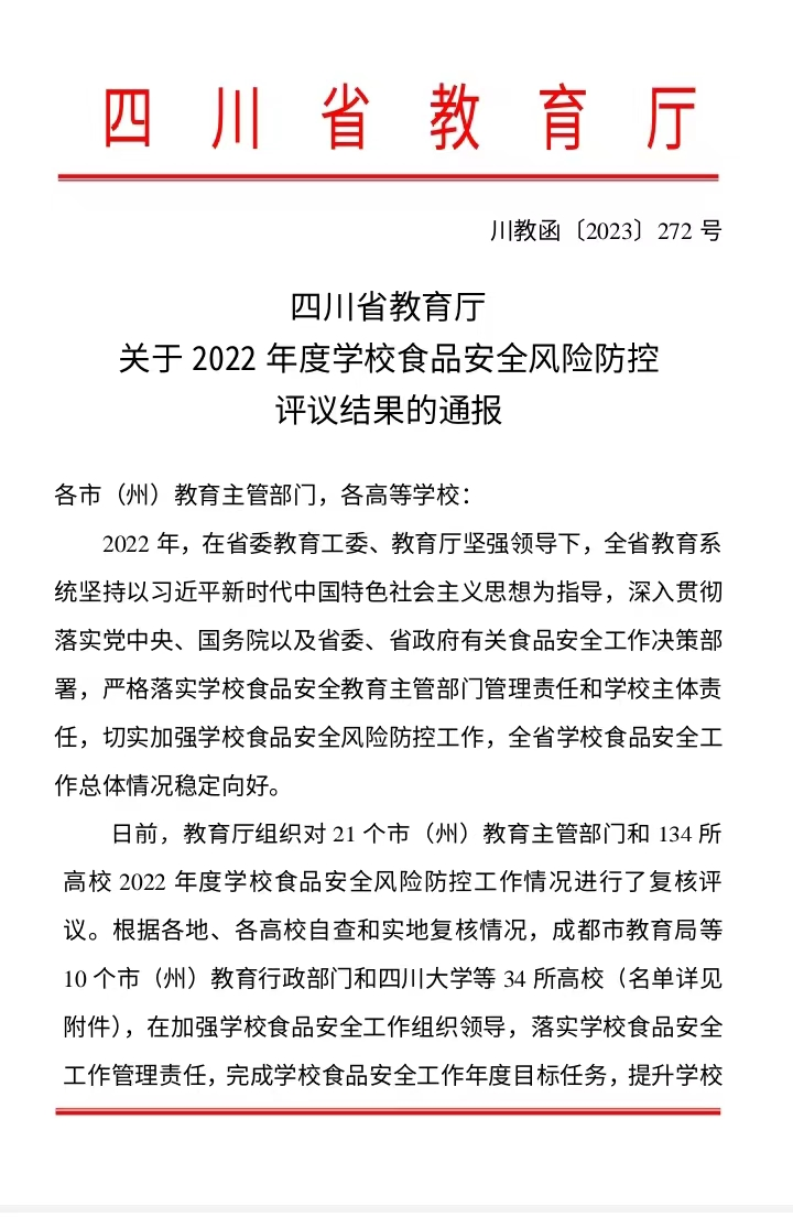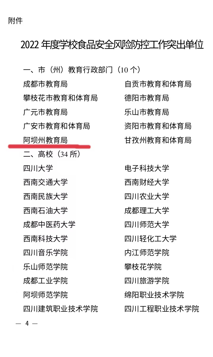 近日,省教育厅印发《关于 2022 年度学校食品安全风险防控评议结果的通报》,对全省教育系统2022年度荣获学校食品安全风险防控突出单位”进行通报,阿坝州教育局名列其中。这是继2021年后,阿坝州教育局再次荣获全省教育系统年度“学校食品安全风险防控工作突出单位”称号。