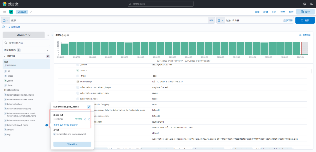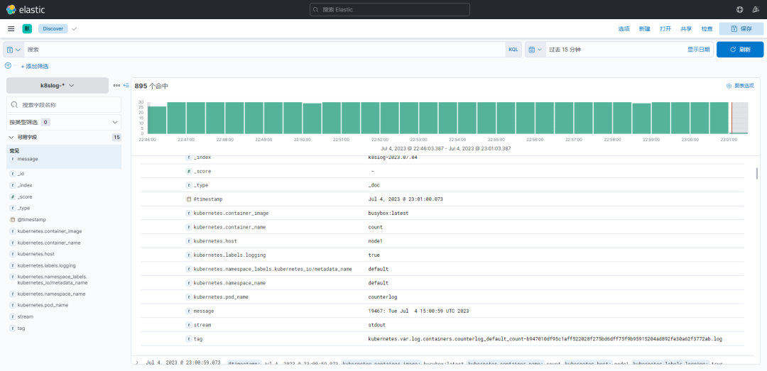 counterlog 1/1 Running 0 9h也可以手动测试下,是否kibana成功绑定了es集群;
