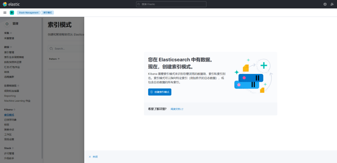 Pod 创建并运行后,回到 Kibana Dashboard 页面,点击左侧最下面的 Management -> Stack Management,进入管理页面,点击左侧 Kibana 下面的 索引模式,点击 创建索引模式 开始导入索引数据:
