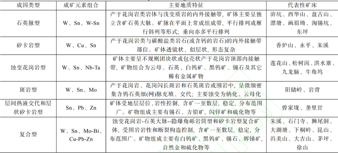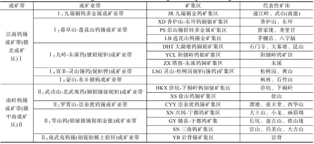 江南钨锡成矿带主体位于扬子陆块东南缘江南古陆,其江西段大地构造单元包括九江坳陷南部、江南隆起带中部的九岭逆冲隆起、万年推覆隆起、怀玉地体以及萍乐坳陷。江南成矿带经历了晋宁期古板块构造格局、扬子期-加里东期华南裂谷系扩张-消亡、华力西-印支期钦杭海盆格局及燕山期钦杭陆盆格局四大演化阶段。自燕山期晚侏罗世钨成矿作用大爆发以来,区内盆山构造格局主要受古太平洋构造体制以及陆内深部构造-岩石圈地幔作用的联合制约,表现为发育深断裂和被其切割而形成的隆、坳地块,控制钨多金属矿的形成并呈南北分带、东西分区特征。隆起地壳“双凸”增厚,分布S型岩浆岩;坳陷区地壳减簿,深断裂切穿下地壳,I型岩浆活动强烈。根据燕山期成矿事件在隆、坳区及其过渡带的岩石圈地壳物质迁移与富集规律,江南成矿带呈现“一隆两坳”格局,江南隆起为江南钨矿带(江西段)中心区。以九岭-朱溪钨铜成矿亚带为中心,两侧为向北侧的幕阜山-莲花山钨锡成矿亚带和向南侧的宜丰-灵山铌钽(钨锡锂)成矿亚带的隆坳过渡带;“两坳”则分别为北侧的九瑞钨铜金硫多金属成矿亚带和南侧的蒙山-东乡铜钨成矿亚带(见表1)。江南成矿带已探明钨资源量超600万吨,超过南岭成矿带百年累计探获钨资源储量总和。该成矿带以单个钨矿床规模大、共伴生组分复杂、成矿年龄新等特点,区别于南岭成矿带的钨矿床。如江南隆起九岭地区的大湖塘钨矿,成矿岩体似斑状白云母花岗岩的锆石U-Pb年龄为144Ma±,以细脉浸染型黑(白)钨矿为主体,兼有石英大脉型、云英岩型及隐爆角砾岩型钨(锡、钼、铜)矿等构成的“多位一体”的矿体组成为特征,成矿时代与赣东北的阳储岭斑岩型钨钼矿床、朱溪矽卡岩型钨铜矿床相近,均形成于晚侏罗世—早白垩世早期(150~140Ma);处于江南隆起两侧过渡带的赣西北香炉山矽卡岩型白钨矿床、东坪石英脉型(黑)钨铜矿床和灵山蚀变花岗岩型、石英脉型铌钽(钨锡锂)矿床形成于135~121Ma的早白垩世。南岭钨锡成矿带(赣中南成矿区)位于南岭东段隆起与湘粤坳陷过渡部位,青白口纪晚期至早古生代属于华南裂谷海盆的中央海盆区。区内盖层褶皱发生显著扭曲和出现东西向成串的构造-花岗岩穹隆,北东、北北东与东西向构造-岩浆-成矿活动发育,呈现北东(或北北东)与东西向构造交汇复合控制矿集区或矿田呈“东西成带北北东向成串”分布格局,形成了世界级的巨量钨锡多金属成矿区。赣中地区的武功山-北武夷钨(铜钼锡铋铌钽)成矿亚带横跨武功山-北武夷隆起与萍乐坳陷带相接,介于江西南、北两大成矿单元之间。带内浒坑钨钼矿、下桐岭钨钼铋矿、徐山钨铜矿等矿床成因较复杂,以成矿元素(钨锡钼铋、铜、稀有金属及硅灰石)多为特色。已发现钨锡稀有金属矿产地有宜春414特大型钽铌锂矿、浒坑钨钼矿、下桐岭钨锡钼铋矿、徐山钨铜矿,永平铜钨硫矿等。赣南地区的罗霄山、崇余犹、雩山、南武夷成矿亚带大地构造位于东南加里东期造山带,燕山期形成隆起区,坳陷规模小,且处于燕山期大陆活化造山的策源地和核心地带,S型成矿花岗岩大规模侵入,石英脉型黑钨矿床(点)密集分布。隆起区及其复合区大多形成石英脉型和蚀变花岗岩型钨矿,如南岭东西向隆起带在江西境内西段与近南北向诸广山隆起复合控制的崇余犹钨锡矿集区;中段与雩山隆起区复合控制的兴国-宁都、赣于和三南钨锡矿集区;东段与武夷山隆起复合控制的南武夷岩背锡矿集区。各矿集区(田)具有各自特点的岩浆—成矿特征:崇余犹、赣县一于都矿集区均以燕山早期S型花岗岩为主要成矿母岩,形成以钨为主,共伴生有锡、钼、铋多金属矿产;三南矿集区燕山早期花岗岩中虽也以S型为主,但有较多规模较大的中侏罗世A型碱性花岗岩(陂头一塔背)和中侏罗世铝质A型花岗岩(中寨等);岩背锡矿集区处于龙南—会昌中生代陆相火山岩带,形成与S型潜火山岩有关的锡、钼、铅锌矿床(如岩背、铜坑嶂等)。江西省内钨与锡密切共生,两者有相同或相似的成岩、成矿特征和时空分布规律。主要形成于燕山期,成岩年龄主要为160~120Ma,并可分为燕山早期晚侏罗世岩体(时限为160~145Ma)和燕山晚期早白垩世早中期岩体(145~120Ma),前者主要分布于南岭成矿带的赣中、南地区(如浒坑、西华山等),后者主要分布在江南成矿带的九岭山-莲花山(如香炉山、大湖塘等)和南武夷地区(见图1)。江南成矿带可分为三个成矿时期:早期晚侏罗世(160Ma±),发生于塔前-赋春一带,塔前主成矿岩体锆石U-Pb年龄值为160.9±2.5Ma、辉钼矿等时线年龄为162±2Ma;中期为主成矿时期,发生于朱溪、大湖塘、阳储岭、九瑞等广大地区,成岩成矿时代为晚侏罗世-早白垩世(150~145Ma);晚期为135~120Ma,发育在香炉山--东坪、莲花山-八字脑等地区。成岩与成矿时差一般为1~10Ma,成矿往往与岩浆演化序列中晚期次侵入体关系更密切。不同学者分别从成因、建造、工业等各个角度提出过不同钨锡矿床分类方案。陈毓川等(2018)主要根据矿床成因类型,矿床的形态、产状、赋矿围岩性质(类型),将中国钨矿床归纳为下列9种类型:石英脉型、矽卡岩型、云英岩型、花岗岩型、斑岩型、陆相火山岩型、层状热液和层状矽卡岩型、风化淋滤铁帽型和砂钨型。依据这一划分方案,本文将江西钨锡矿床归纳为下列6种类型,即矽卡岩型、石英脉型、蚀