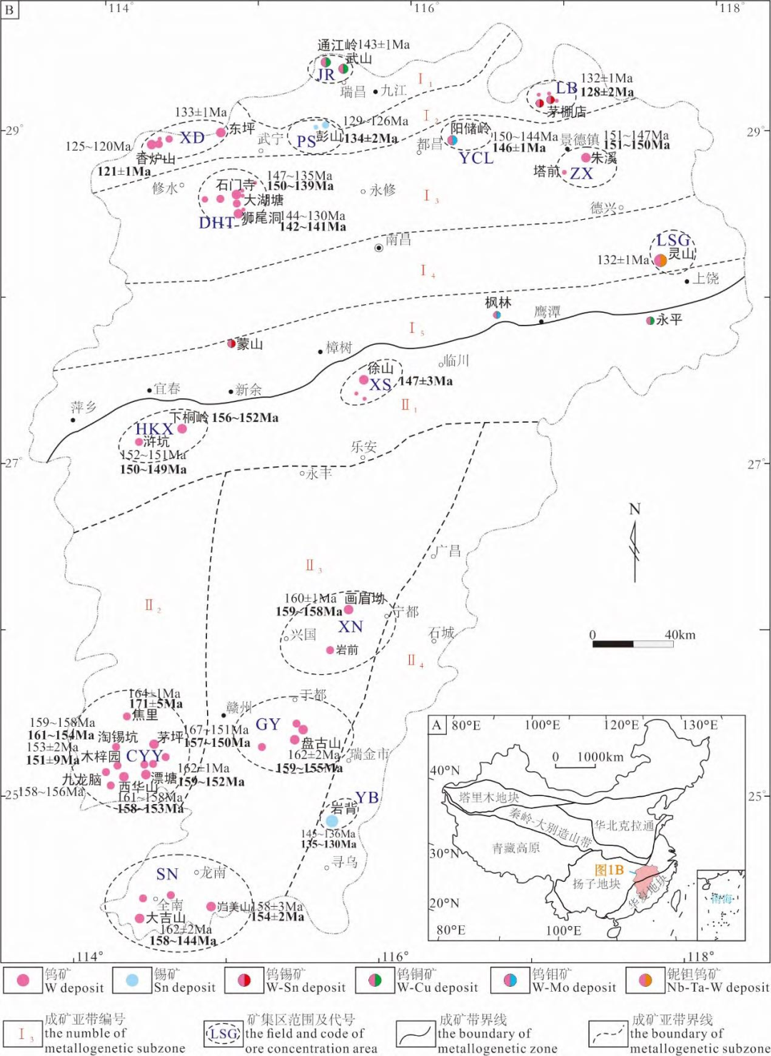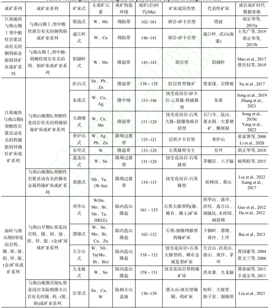 2.2.1 江南地块与燕山期I型中酸性岩浆活动有关的钨铜钼金银铅锌矿床成矿系列本系列为作者新厘定的矿床成矿系列,主要分布在江南成矿带,包括与燕山期I1型次火山岩、斑岩有关的铜钨钼金铅锌铁矿床和与燕山期I2型斑岩有关的钨钼矿床两个成矿亚系列。与燕山期I1型中酸性-弱酸性斑岩有关的钨铜钼金铅锌矿床亚系列:主要分布在塔前-朱溪一带和九江-瑞昌地区,含塔前式、通江岭式等2个矿床式。成矿母岩多为浅成相小型岩体,呈岩株、岩脉状产出,主要岩石有花岗闪长斑岩、石英闪长玢岩、英安斑岩等。形成于燕山早期强烈造山阶段,产于板缘和陆内活化断裂带,常见于晚古生代坳陷带。有关的矿化以铜、钼、金为主,钨、银、铅、锌亦有重要地位。与燕山期I2型中酸一弱酸性斑岩有关的钨钼矿床成矿亚系列:以都昌县阳储岭钨钼矿床为代表,另有善坑铜钼矿、邦彦坑钨矿、庄前钼矿等一批矿点,称阳储岭式,产布于赣中北部板缘深断裂带和赣东北深断裂带北段及其推(滑)覆构造带。成岩成矿时期主要为燕山中晚期,成矿岩体主要为中酸性花岗闪长斑岩、二长花岗斑岩、花岗闪长岩,还有隐爆角砾岩分布,与I1型斑岩比较其岩石化学成分偏酸性具富碱高钾特点,显示以壳源为主的壳幔混熔的岩源特征。2.2.2 江南地块与燕山期S型酸性岩浆活动有关的钨锡银铅锌矿床成矿系列该矿床成矿系列为全国厘定的22个与钨锡有关的矿床成矿系列之一,主要分布在江南成矿带。在不同的地质构造环境,岩浆活动方式及其定位深度差异较大,成矿特征亦有明显差别,可进一步分为与S1型酸性花岗岩有关的钨锡萤石矿床成矿亚系列和与S2型中酸性岩浆活动有关的稀有金属、钨锡、银铅锌铀钍矿床成矿亚系列。与燕山晚期S1型酸性花岗岩有关的钨锡萤石矿床成矿亚系列:主要形成于燕山晚期晚侏罗世到早白垩世,空间上主要分布于九岭隆起带。成矿岩体同位素年龄为150-124Ma,成矿年龄145-120Ma,成岩成矿时间相近。以钨(白钨)为主,其次为锡、铅、锌、银,共伴生钼、铜、金矿化较强。分别形成以钨、锡、铅锌、金为主矿化组合。矿床类型、矿床式和典型矿床有:复合型矿床:朱溪式钨铜矿、大湖塘式钨铜(锡钼)矿床;矽卡岩型矿床:香炉山式钨矿(香炉山、洞下钨矿床),层状热液和层状矽卡岩型:彭山式锡(锑)矿(曾家垅、黄金洼锡矿床);花岗岩型矿床:茅棚店式锡矿。与燕山晚期S2型中酸性岩浆活动有关的稀有金属、钨锡、银铅锌铀钍矿床成矿亚系列:主要分布于江南隆起带南侧过渡带及萍乐坳陷,成矿构造环境为燕山晚期后造山-伸展转换构造环境;成矿岩体碱度更高,更富钾,稀土元素含量较高,轻稀土富集程度更高,铕亏损更强,但分异演化程度较低。形成矿床类型除蚀变花岗岩型外,细晶岩型和伟晶岩型矿床也很发育。代表性矿床式:松树岗式钽铌锂钨锡矿(松树岗)、同安式钽铌锂矿(同安、牌楼、白水洞、白果钽铌锂矿床);复合型:黄山式钽铌锂钨锡矿床(蚀变花岗岩型+伟晶岩型)。2.2.3 南岭与燕山期S型花岗岩钨、锡、钼、铋、铅、锌、银、(金)矿床成矿系列该成矿系列为全国厘定的22个与钨锡有关的矿床成矿系列之一,主要分布在钦杭成矿带南侧和南岭成矿带。可进一步分为以下二个成矿亚系列:与燕山早期S1型花岗岩钨、锡、钼、铋、铅、锌、银、(金)矿床成矿亚系列:主要分布于江西中南部,又相对集中于武功山—徐山、崇余犹、雩山和“三南”地区。成矿岩体形成于燕山早期中晚侏罗世,同位素年龄为168~150Ma,成矿年龄为162~149Ma,两者时差小于10Ma,一般为1~7Ma。以钨为主,可形成独立钨矿,共伴生锡、钼、铋、铅锌、银、铌钽、铍、稀土等;矿床类型有热液石英脉型、矽卡岩型、蚀变花岗岩型(含云英岩型)。其中以黑钨矿—石英脉型最主要,空间上构成自下而上的“五层楼+地下室”成矿模式。代表性矿床式有石英大脉型黑钨矿矿床:西华山式(W、Mo、HREE、Be)、盘古山式(W、Bi);石英细脉一网脉型黑钨矿矿床:漂塘式(W、Sn)、下桐岭式(W、Mo、Bi);复合型矿床:大吉山式(W、Nb、Ta)、徐山式(W、Cu)、岿美山式(W、Sn、Bi、Cu)等。与燕山晚期壳熔S2花岗岩及陆相潜火山岩有关的锡、钨、(铌、钽)成矿亚系列:主要分布于武夷成矿带南段西坡与南岭成矿带东端复合部位。发育一系列火山构造、潜火山隐爆构造,是区内锡、(铌、钽、钨、铜)矿床的控矿构造。矿床往往产于正向火山构造中,成矿岩体主要为早白垩世S型酸性潜火山岩和中浅成花岗岩。典型矿床式有斑岩型:岩背式锡(铜)矿(岩背、松岭、上湾锡矿床);隐爆角砾岩型:淘锡坝式锡矿(淘锡坝、大窝里钨锡矿)。十余年来,江南地块内九岭、幕阜山构造隆起区大湖塘、东坪超大型钨矿床,“隆中坳”区朱溪超大型钨矿床、松树岗超大型钽铌(锂)钨锡矿床,以及彭山穹隆区垄里甘锡矿和九瑞坳陷区武山深部“上铜下铜钨矿体”等矿床的新发现,表明江西“北铜南钨”成矿说已成历史,江南钨锡成矿带的建立具有钨锡找矿划时代的意义。朱溪钨(铜)矿床位于江南成矿带内九岭-朱溪钨(铍钼铌钽)成矿亚带朱溪-塔前钨铜矿集区。地表仅有零星铜矿体出露,王先广等(2020b,2022)等通过对朱溪矿集区的地质调查和综合分析,发现朱溪钨矿集区深部存在矽卡岩型矿体,突破了以往勘查重点为斑岩型、热液脉型铜矿的认识,勘查方向向寻找矽卡岩型钨矿的战略转变