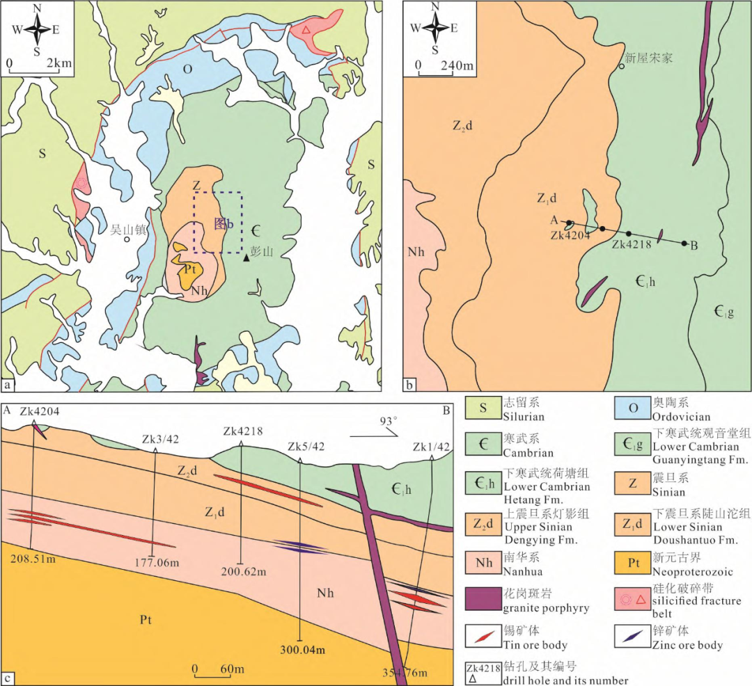 东坪矿床的成因类型为岩浆期后高中温热液矿床,其工业类型为“五层楼”石英脉带型黑钨矿床,具有工业价值的矿体主要位于细脉带、中脉带、大脉带。黑钨矿U-Pb法定年获得大湖塘矿区、东坪矿区成矿年龄分别为(137.3±4.8)Ma、(129.5±4.8)Ma,表明江南成矿带(江西段)存在两期石英脉型黑钨矿成矿事件。毛景文等(2020)提出江南钨矿带两期钨矿分别是古太平洋板块俯冲和后俯冲过程的产物,认为地壳泥质岩石重熔形成的花岗岩浆上侵定位,部分岩浆源区含基性-超基性岩夹层抑或在形成过程有地幔物质加入,经过高分异演化,在岩浆房隆起部位的内外接触带成矿。彭山锡多金属矿田位于九江坳陷南缘彭山穹隆,矿床围绕沿穹隆侵位的隐伏早白垩世(130~128Ma)花岗岩钟分布,近外接触带为曾家垅、尖峰坡锡矿床,周缘有张十八铅锌矿床,边缘部位为热液脉型锑矿和萤石矿床,构成自岩体中心由高温向周缘中低温热液成矿分带。垄里甘锡多金属矿普查查区位于彭山锡多金属矿田东侧(图5a),近期江西省地勘基金项目圈定了三个共生锡、锌工业矿体,锡矿体产于成矿岩体与南华系、震旦-寒武系围岩接触带,顺层呈似层状产出(图5b,c),产状与地层产状近于一致,受背斜轴部层间剥离带控制。矿化类型以似层状矽卡岩型锡矿和似层状砂岩浸染状锡矿为主。锡矿体平均厚度3.58m,锡平均品位0.57%。估算锡矿达中型规模,取得了锡矿找矿新进展。图5 彭山锡多金属矿田地质图(a)、垄里甘矿区地质简图(b)和42线地质剖面图(c)