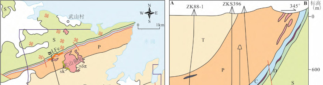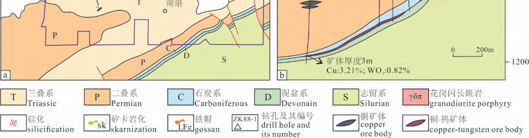 由灵山岩体的中心相→过渡相→边缘相→松树岗隐伏岩体,人工重砂中的钽铌铁矿、锡石、闪锌矿、方铅矿等矿物逐渐增多,钽、铌、锂、铷、铯、锡、钨、铅、锌、铜等成矿元素丰度明显升高。据硫同位素分析结果,矿区δ34S全为正值,变化范围在+0.6‰~+6.0‰之间,变化幅度仅0.52%,平均值+2.76‰,接近陨石硫,来自地壳深部岩浆源。铅同位素资料表明,矿区铅同位素组成稳定、均一,富204Pb,贫放射成因206Pb、208Pb,属正常铅范围,和硫一样,主要来自地壳深部岩浆源。按正常铅计算其模式年龄为115~126Ma,与K-Ar法测定的下部隐伏岩体的同位素年龄124~131Ma接近,说明成矿时间紧接在成岩之后。矿区伟晶岩中钽铌铁矿物U-Pb法定年130Ma。矿区石英脉中的氧同位素组成与其下隐伏岩体的氧同位素组成基本一致,前者δ18O值为+9.97‰~+10.03‰,隐伏岩体的δ18O值为+9.51‰~+10.78‰范围,两者极为接近,表明氧具有共同的来源。从成岩、成矿物质来源和时空关系综合分析,松树岗钽铌钨锡矿床与深部隐伏花岗岩株有着密切的成因联系,成矿作用可能包括岩浆熔离晚期的结晶分异(碱质交代作用)和高-中温岩浆热液充填二个阶段。岩浆结晶分异作用早期部分铌钽钨锡进入黑云母和副矿物晶格中预富集在侵入岩顶部,晚期残浆中钾氟浓度升高,随着成矿溶液温度下降,酸度增高,形成铁锂云母、石英、黄玉等云英岩矿物,铌钽钨锡与溶液中的Fe2+、Mn2+等元素结合生成细晶石、钽铌铁矿、黑钨矿、锡石沉淀,钽铌全部析出。热液成矿作用后期部分以流体相为主的组份发生脉动式的减压沸腾和贯入,充填于围岩和裂隙,形成钨、锡石英脉和钨锡铅锌石英脉。3.6 九瑞矿集区深部新发现“上铜下钨(铜)”矿体的南港铜钨矿床根据矿床成矿系列“全位成矿、缺位找矿”理论,作者提出九瑞地区“上铜下钨”的勘查模型,开创了赣北九瑞地区寻找钨矿的先河。通过地质填图、化探异常找矿信息提取、电磁三维反演深部定位技术应用,相继在成矿地质条件类似的通江岭、武山矿区边深部首次发现了钨铜矿体。武山铜矿外围南港矿区在深部似层状块状硫化物矿体中含有钨矿体,属于武山铜矿似层状硫化物型矿体的倾向延伸部分(图7a)。区内铜钨矿体主要产出于泥盆系五通组与黄龙组之间,乃至黄龙组下段层位,矿石类型主要为含铜黄铁矿和含铜碳酸盐。在南港矿区88~112线似层状块状硫化物矿体中含有钨矿体,钨矿体全长近1600m,88~96线800m范围内为主要工业矿体地段。局部地段具分枝、复合、膨大、缩小、尖灭、再现等现象。钨矿(化)体厚度一般在0.50~3.36m,平均3.18m,WO3平均品位0.72%。西部80线钨矿体逐渐尖灭,并逐渐演化为铅锌银(铜)矿,向东104线尖灭,在112线再现钨矿(化)体(图7b)。垂向上上部以铜、铜硫矿化为主,深部钨矿化逐渐增强,在南矿带的矽卡岩型矿体中深部同样发现钨、铜矿物组合。图7 武山南港矿区地质简图(a)和地质剖面图(b)