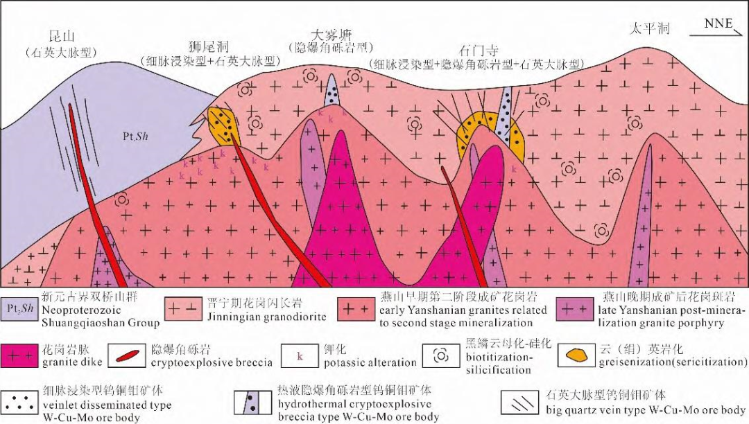 I号矿体为主矿体,沿F2推滑覆构造面展布,走向延伸1200m,倾向延深140~1918m,矿体平均厚度146.66m,WO3平均品位0.57%,共生Cu品位主要介于0.3%~0.8%之间,局部高达4.21%。云英细脉-网脉型钨矿体主要呈透镜状和脉状赋存于30-54线栖霞组不纯灰岩内的石英-白云母-绢云母细脉中,WO3平均品位约为0.15%~0.21%。与成矿有关的花岗岩体主要为黑云母花岗岩、白云母花岗岩和花岗斑岩,锆石U-Pb年龄(154~146Ma)、锆石Hf同位素组成(εHf(t)=-13.6~-6.2)和全岩Nd同位素组成(εNd (t)=-12.5~-7.0),为同源岩浆活动的产物。同时,不同学者运用辉钼矿Re-Os体系、热液成因白云母40Ar-39Ar体系、花岗岩中蚀变磷灰石U-Pb体系以及蚀变矽卡岩中石榴石和榍石U-Pb体系等多种测年手段,获得朱溪矿区成矿年龄集中在153~146Ma,与花岗岩体年龄基本吻合,表明成矿作用与酸性岩体侵入密切相关。大湖塘钨(铜)矿田位于江南成矿带九岭-朱溪钨(铍钼铌钽)成矿亚带九岭矿集区内,燕山期成矿花岗岩呈“体中体”式侵位于晋宁期黑云母花岗闪长岩中。矿田内主要矿床有大雾塘钨矿、蓑衣洞钨矿、茅公洞钨矿、新安里钨锡矿、东陡崖钨锡矿、石门寺钨钼矿、昆山钨钼矿、大河里钨钼矿等。典型矿床为石门寺钨钼矿,区内累计提交了钨资源储量(W03)约176万吨,WO3平均品位0.18%。石门寺矿区主要矿体为蚀变花岗岩细脉浸染型,呈似层状产于燕山期似斑状黑云母花岗岩瘤与晋宁晚期黑云母花岗闪长岩基的内、外接触带,产状总体平缓,与接触面的产状基本一致。其中,外接触带多见厚大工业钨(铜)矿体,矿化连续性较好;内接触带矿体普遍较薄较贫,夹石多,矿化连续性较差。主要矿(化)体东西长大于1400m,南北宽大于800m,单工程钨矿体累计厚度18.96~489.54m,WO30.192%~0.279%。次要矿体有二种类型:一是分布于矿区中部和似斑状黑云母花岗岩瘤顶部的热液隐爆角砾岩型矿体;二是平面与剖面上分布相对广泛、穿切矿区所有岩石单元和上述两类矿体的石英大脉型黑钨矿体。这三类矿体围绕燕山期成矿花岗岩体,共生或交织,形成大湖塘钨(铜)矿田一个石门寺矿区三种类型的“一区三型”钨多金属矿床(图3)