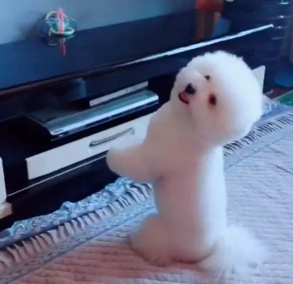 这只小比熊在原地尝试性的跳起来试了好多次,可是呢就是拿不到,始终就差那么一点,最后急的小家伙在原地呜呜直叫。不过下一秒呢,有趣的一幕就出现了!