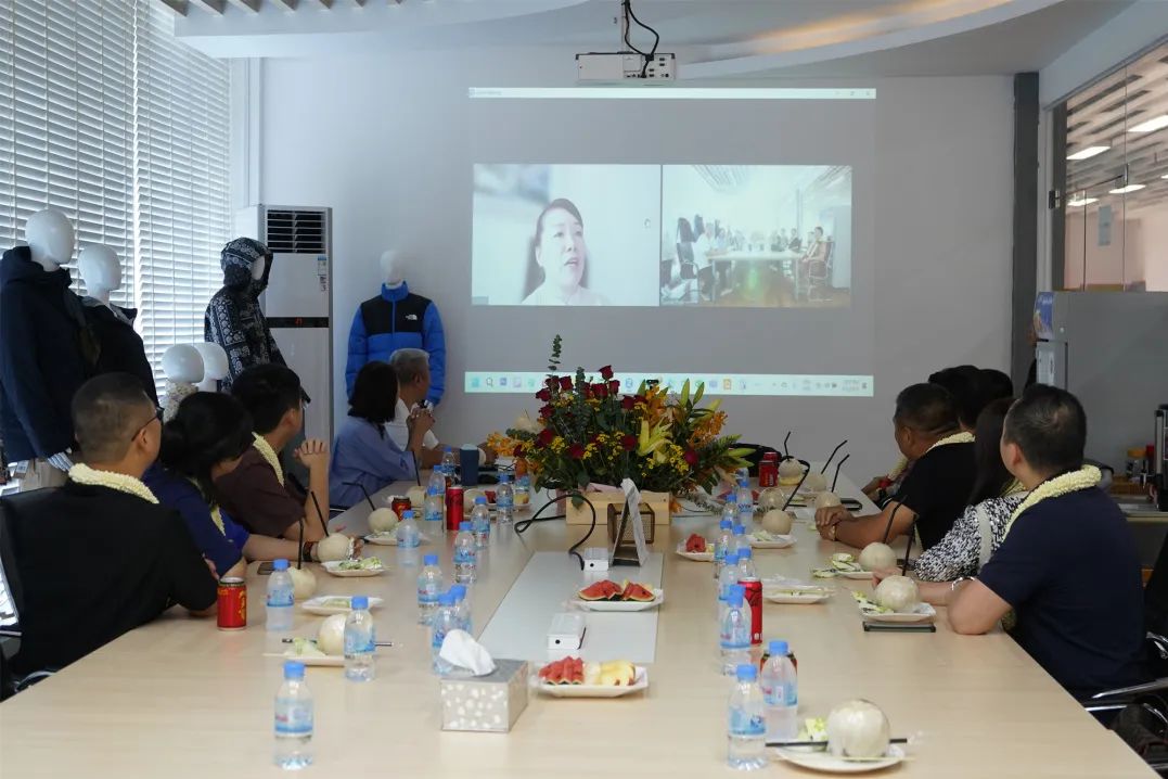 公司总经理桂珊珊视频连线欢迎考察团一行的到来,宁波宏盛户外有限公司柬埔寨基地,2013年正式投产生产,工厂总面积 120,000平方米,现有员工10,000余人,已成为世界排名前列的背包及户外服装品牌 JANSPORT、PRADA、The Northface、VANS、EASTAPAK、KIPLING 、Dickies、Advantus、FOSSIL、NAPAPIJRI、Jack Wolfskin 等著名品牌的生产基地。