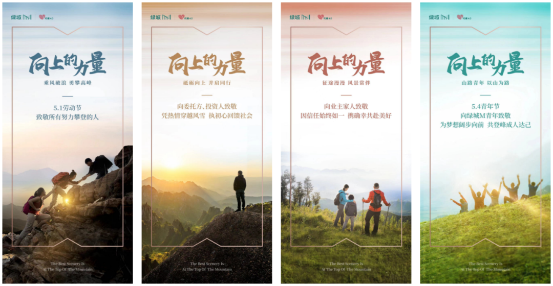 打破以往地产品牌对于节气海报的认知思维,绿城管理的节气海报选择与「M登山模型」进行结合,真正面向B端说话。借势节气,发布登山模型知识点海报——登山「知」时节系列。