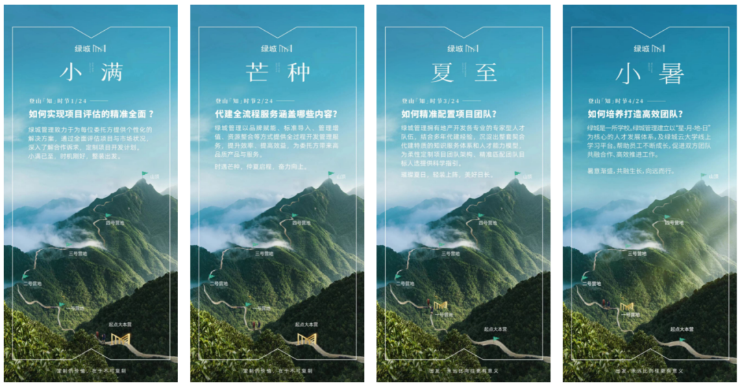 通过统一的排版形式,展现登山模型的6大营地、23个标准化节点,运用绿城管理广告视觉规范,既突出登山模型知识点内容,又融入战略花边,让节气海报成为绿城管理的知识型节气IP。